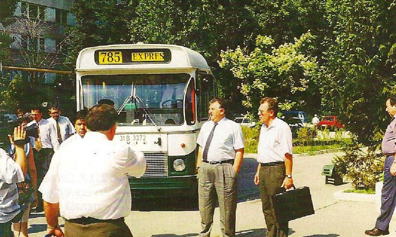 Un autobuz Saviem la inaugurarea introducerii cartelei cu bandă magnetică, fotografia a fost preluată din arhiva RATB-ului.