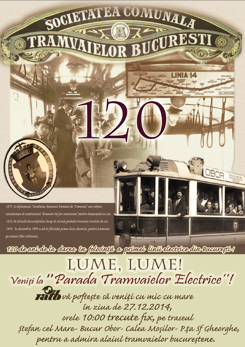 Cu ocazia aniversării a 120 de ani de la darea în folosinţă a primei linii electrice din Bucureşti, Regia Autonomă de Transport Bucureşti va organiza, în data de 27 decembrie, începând cu ora 10.00, evenimentul „Parada tramvaielor electrice”.