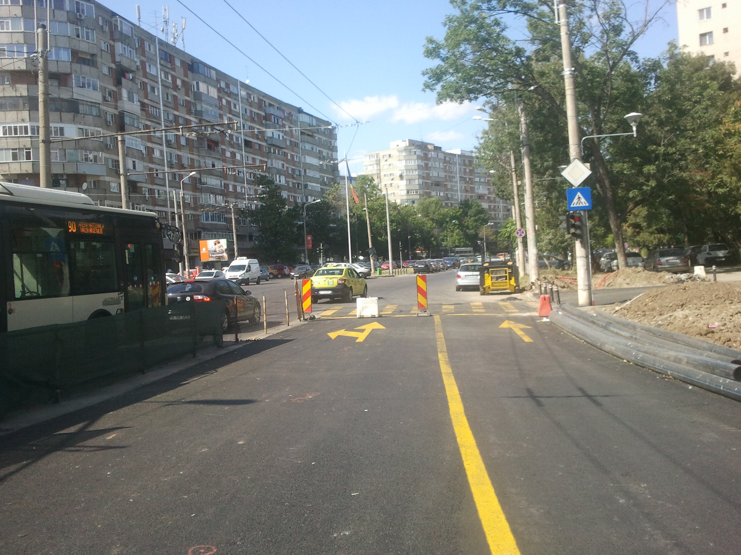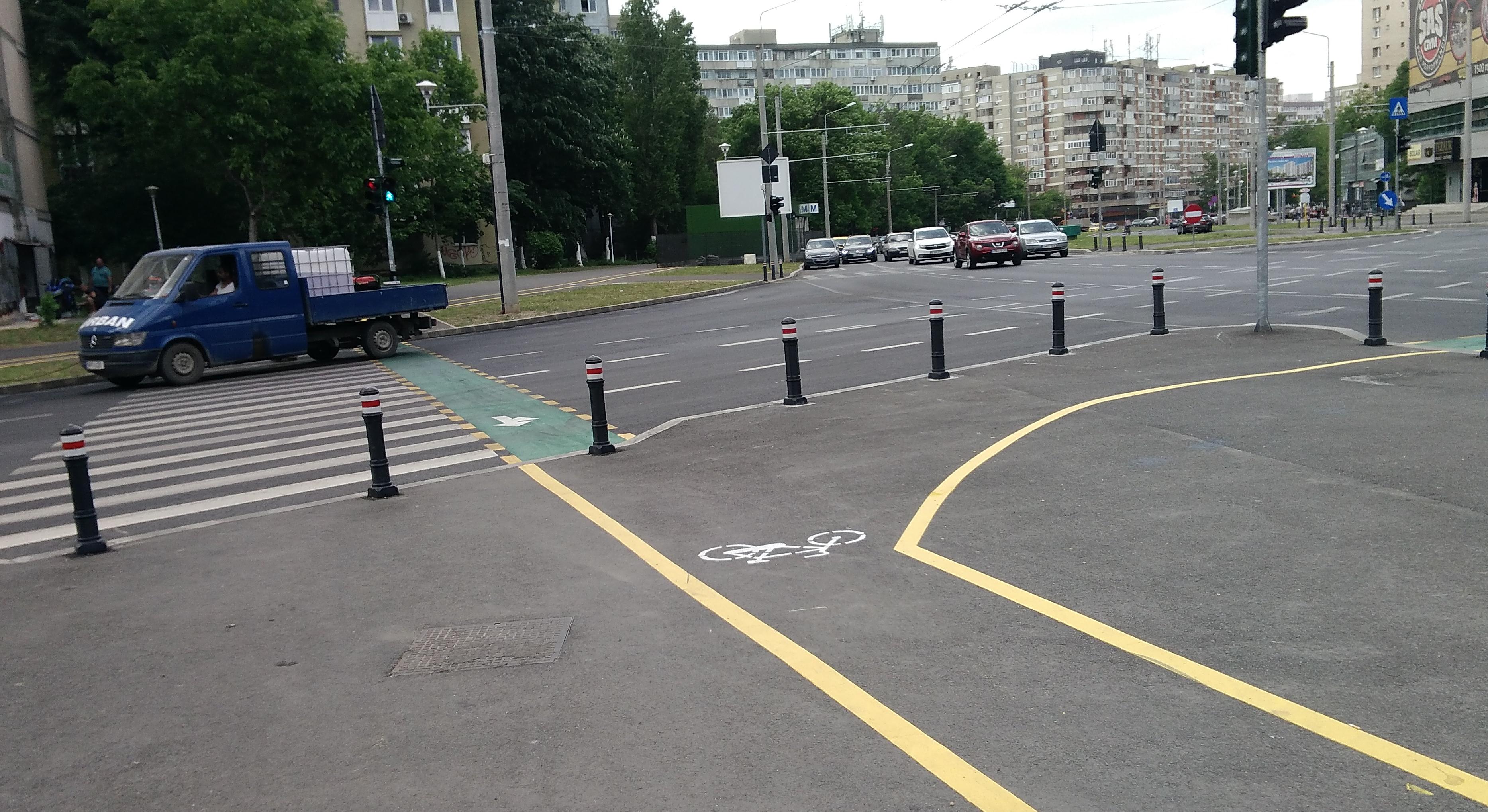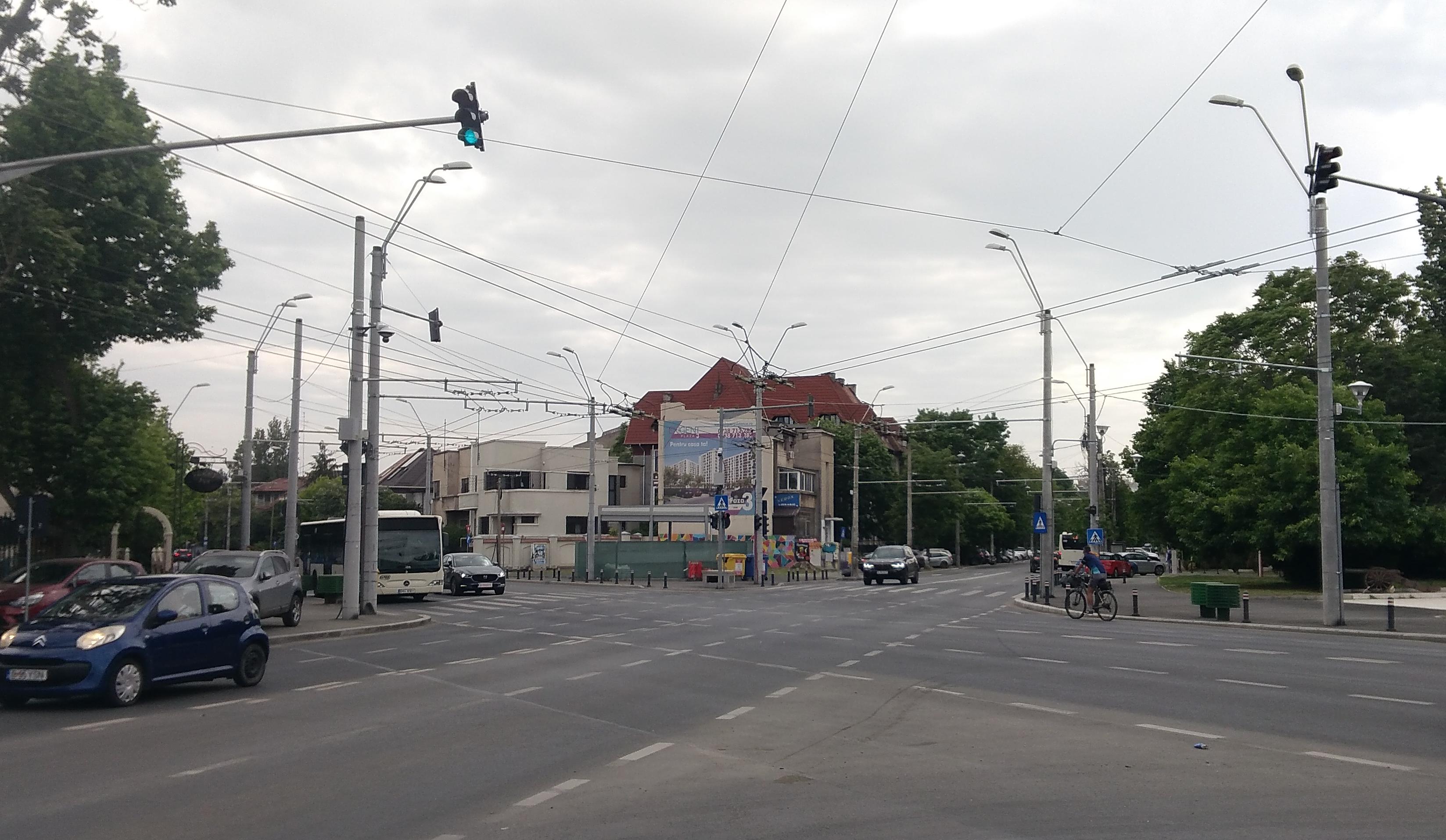 Dar reţeaua de troleibuz a rămas pe vechea poziţie, astfel că troleibuzul face stânga de pe banda cu obligatoriu înainte...