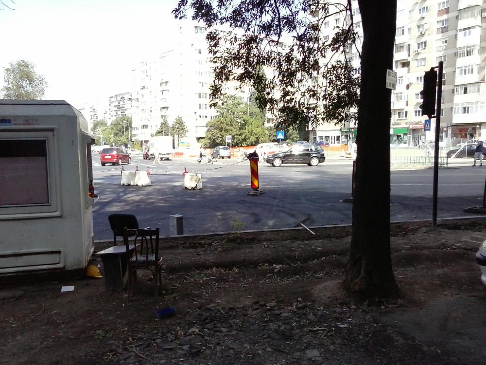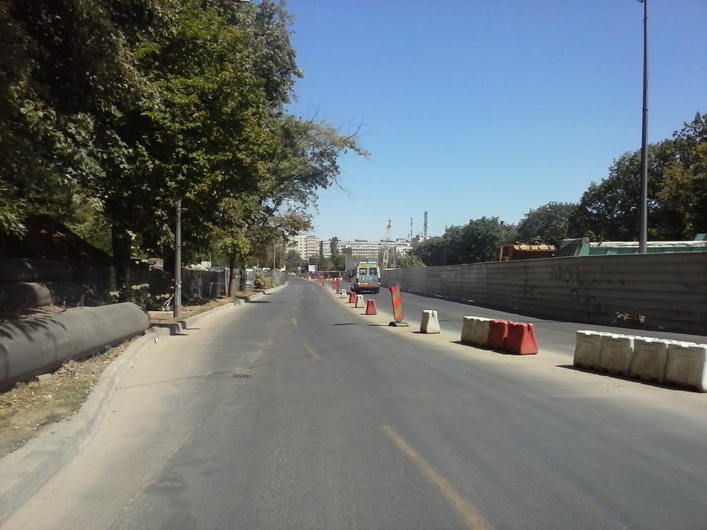 O vedere in lungul bulevardului cu zona statiei Romancierilor. Si aici se asteapta in van o noua deviere a traficului auto peste zona de bulevard refacuta peste planseul statiei in vederea executarii de lucrari la accesurile neatacate. Desi pregatirile sunt la stadiu de 95% pentru aceasta mutare.