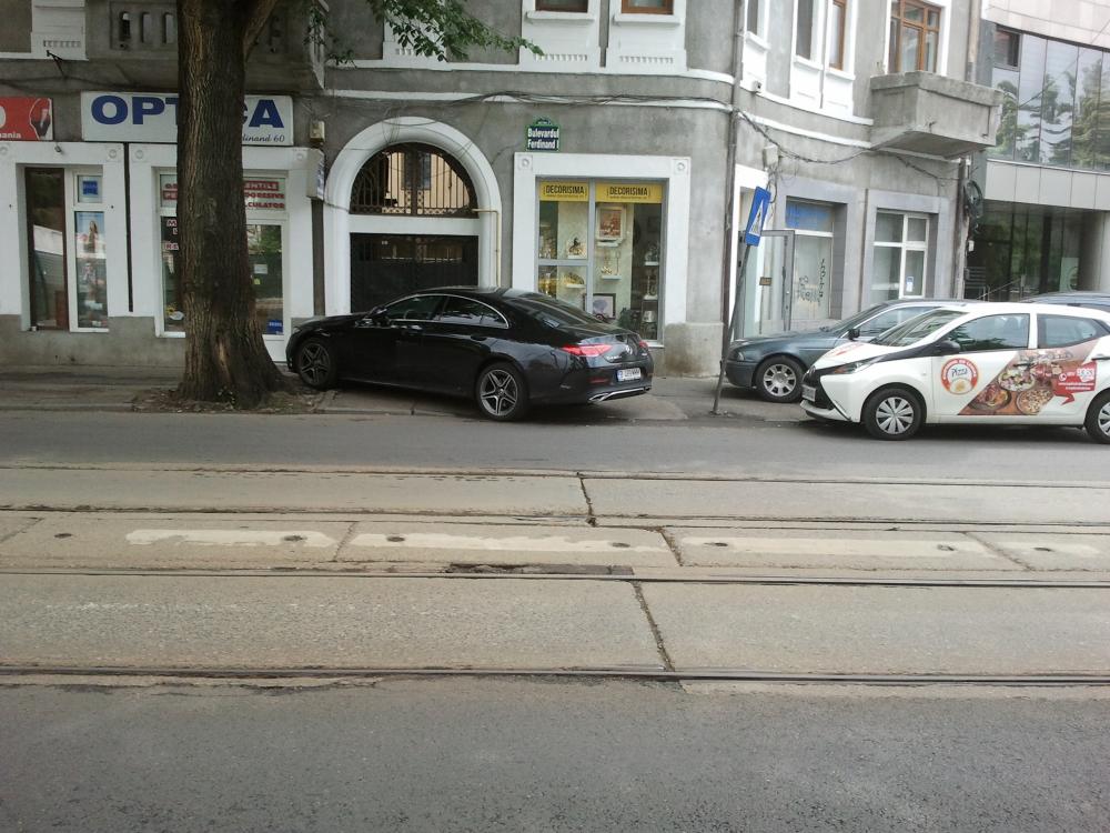 Cum se prezinta o trecere pentru pietoni in Bucuresti pe Bd. Ferdinand! Fara marcaj de un deceniu, indicatoarele intr-o rana stau sa cada si pietonul este inobservabil datorita masinilor parcate si acum cu un mare bonus: rampa pentru carucioare inglobata in trotuar este perfecta pentru garda mica la sol a unui @#%$!&* cu Mercedes.