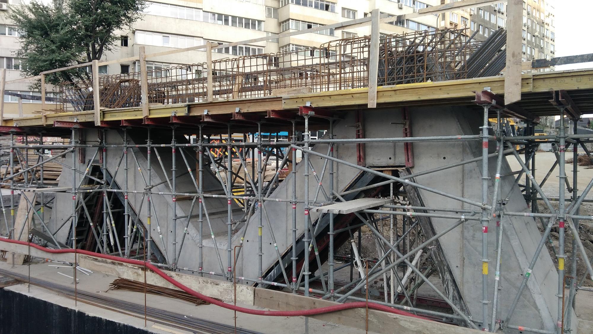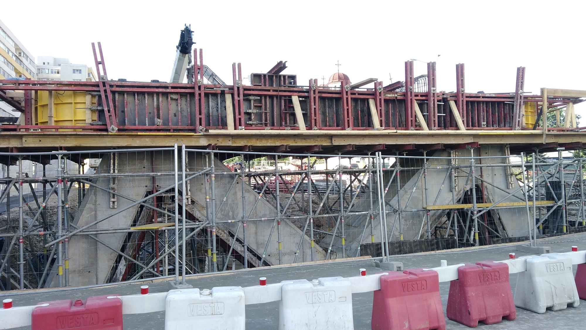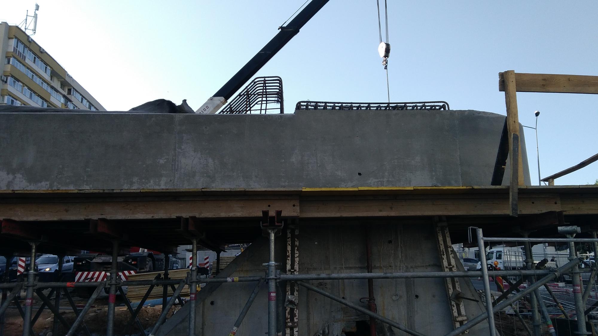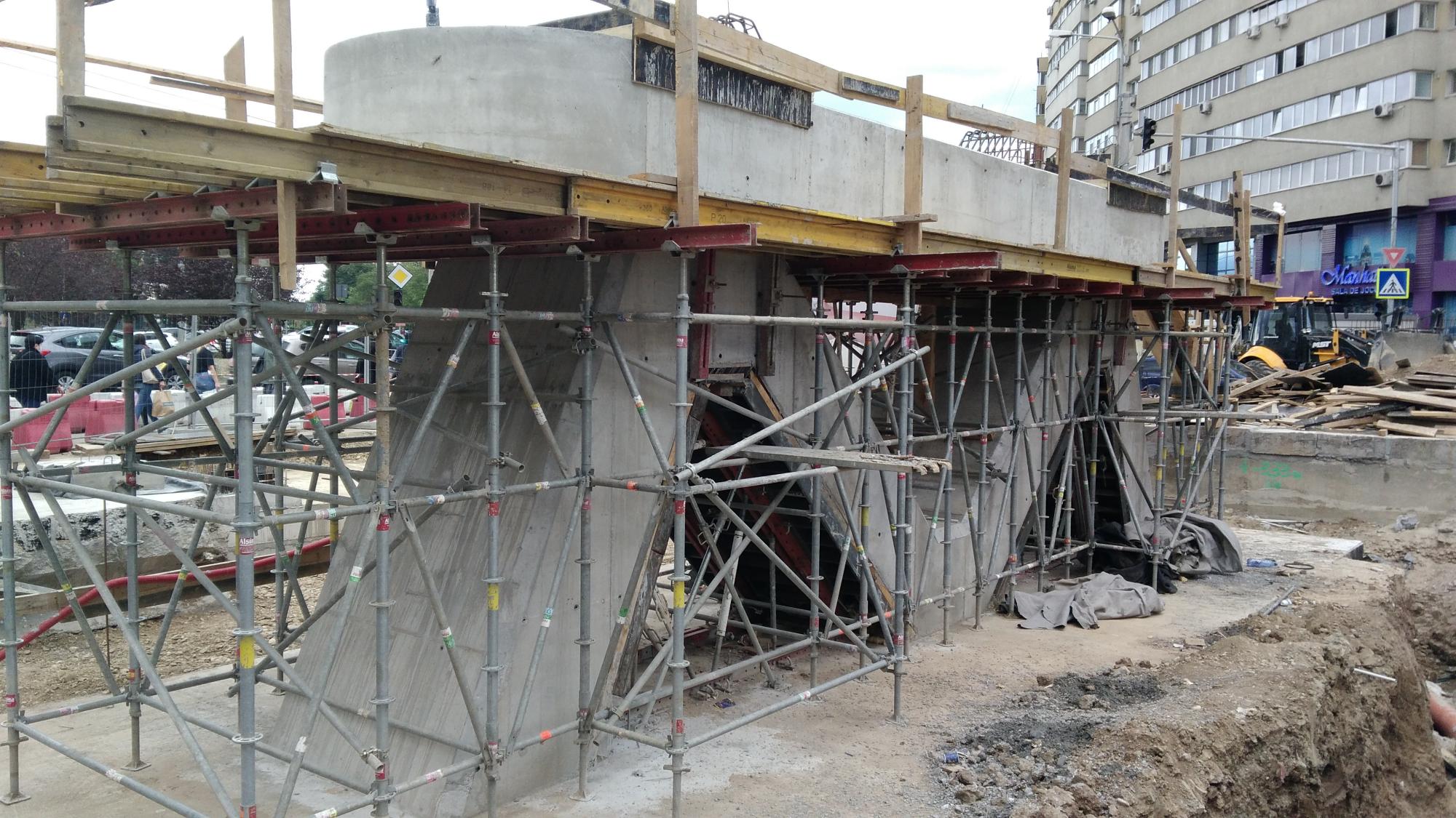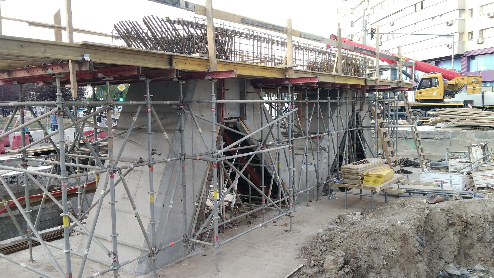 Avem 3 seturi a cate 2 fundatii pentru reazemele temporare ale grinzilor dintre culeea Tei si pila parc, probabil trebuie sa mai vina un set. Au pus si schele pe doua din seturi deci probabil trebuie sa vina reazemele.