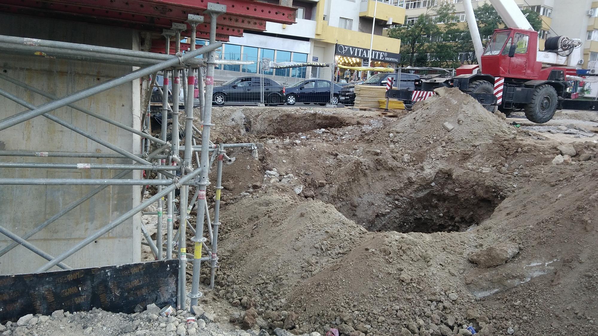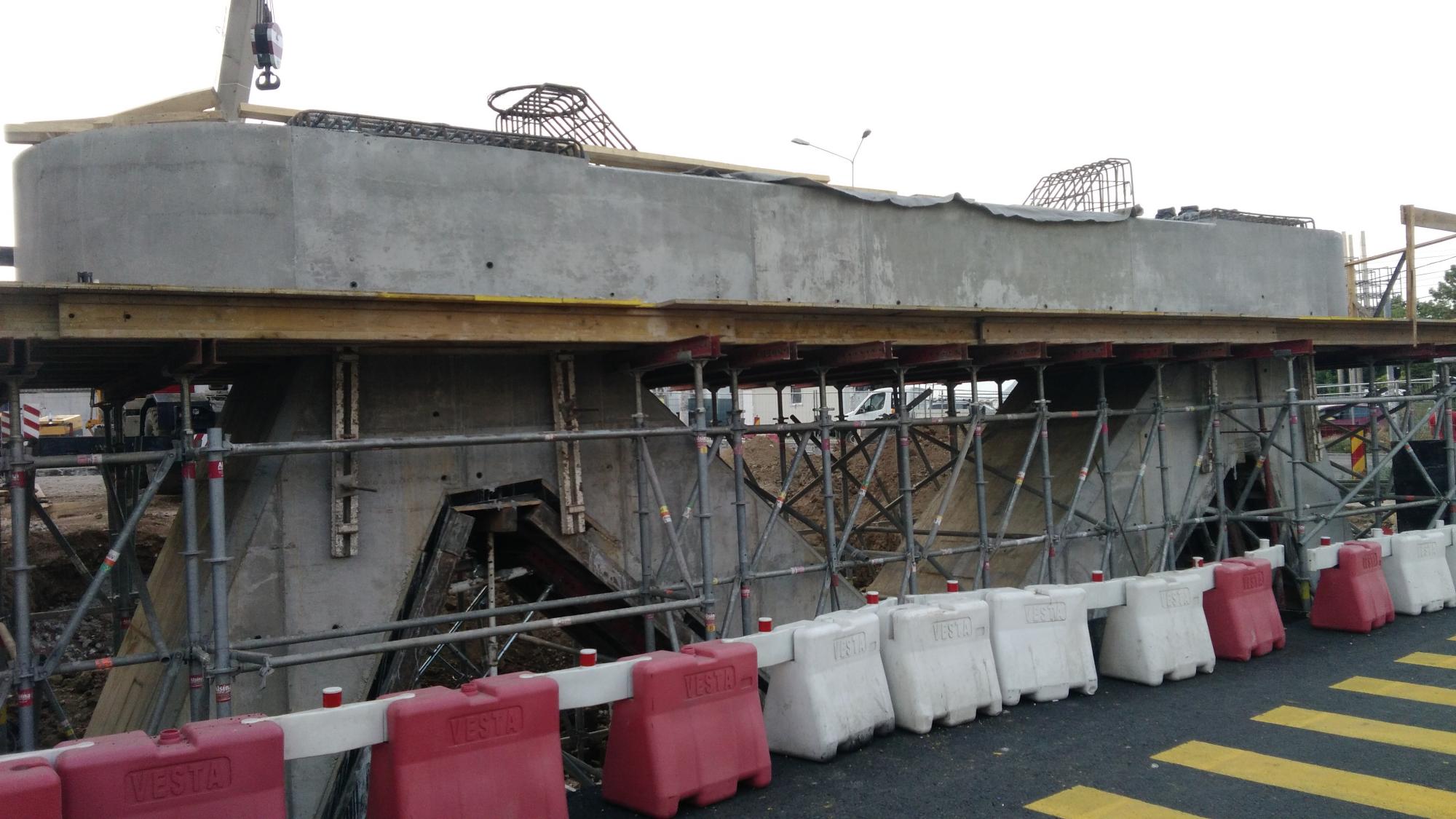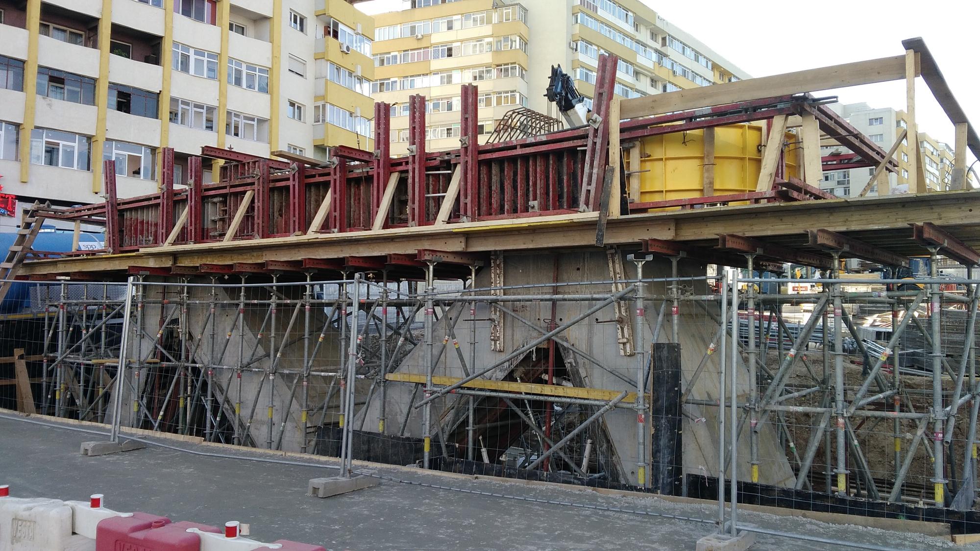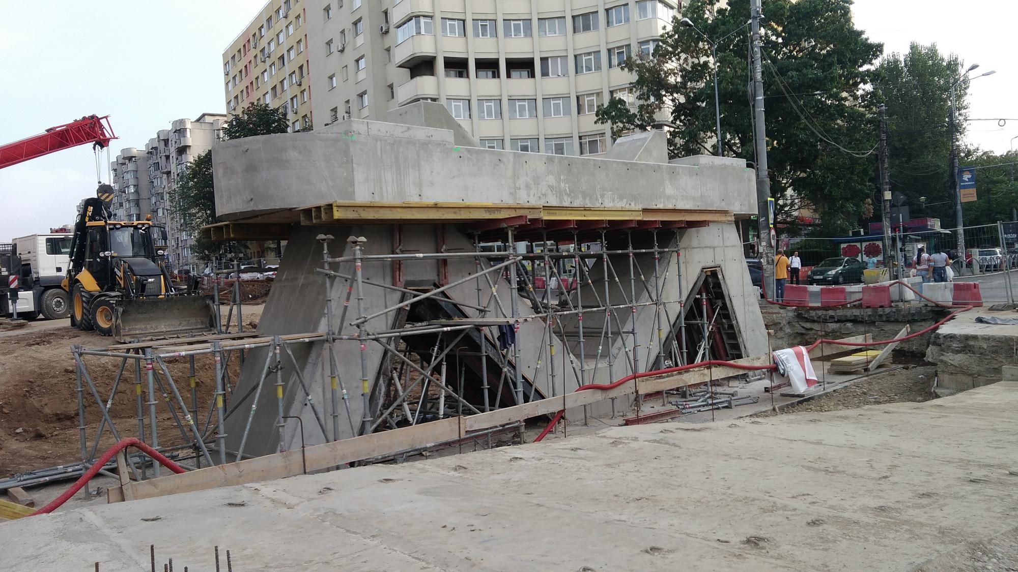 Avem 3 seturi a cate 2 fundatii pentru reazemele temporare ale grinzilor dintre culeea Tei si pila parc, probabil trebuie sa mai vina un set. Au pus si schele pe doua din seturi deci probabil trebuie sa vina reazemele.