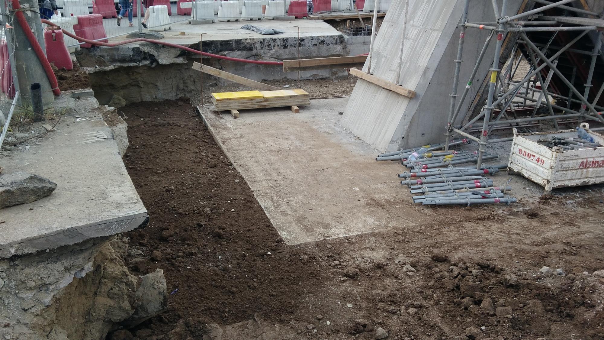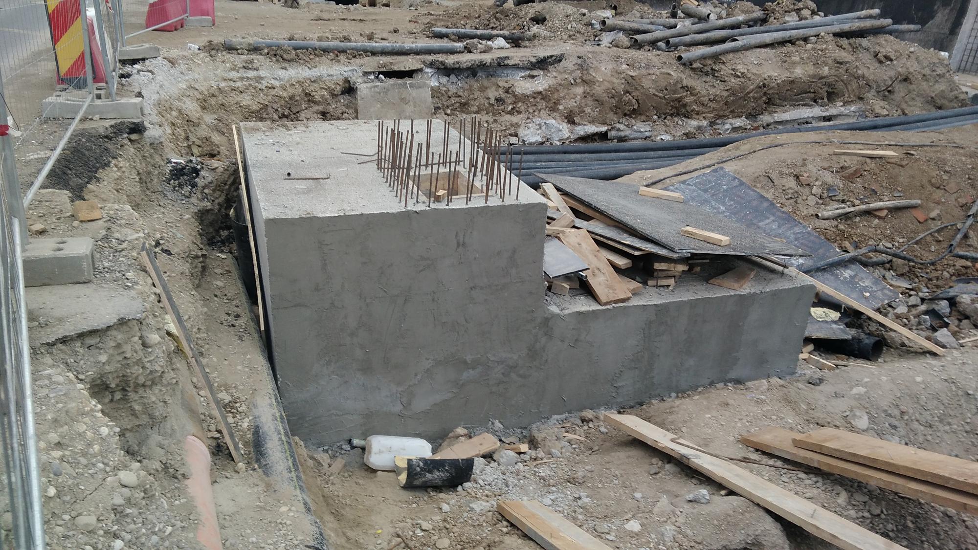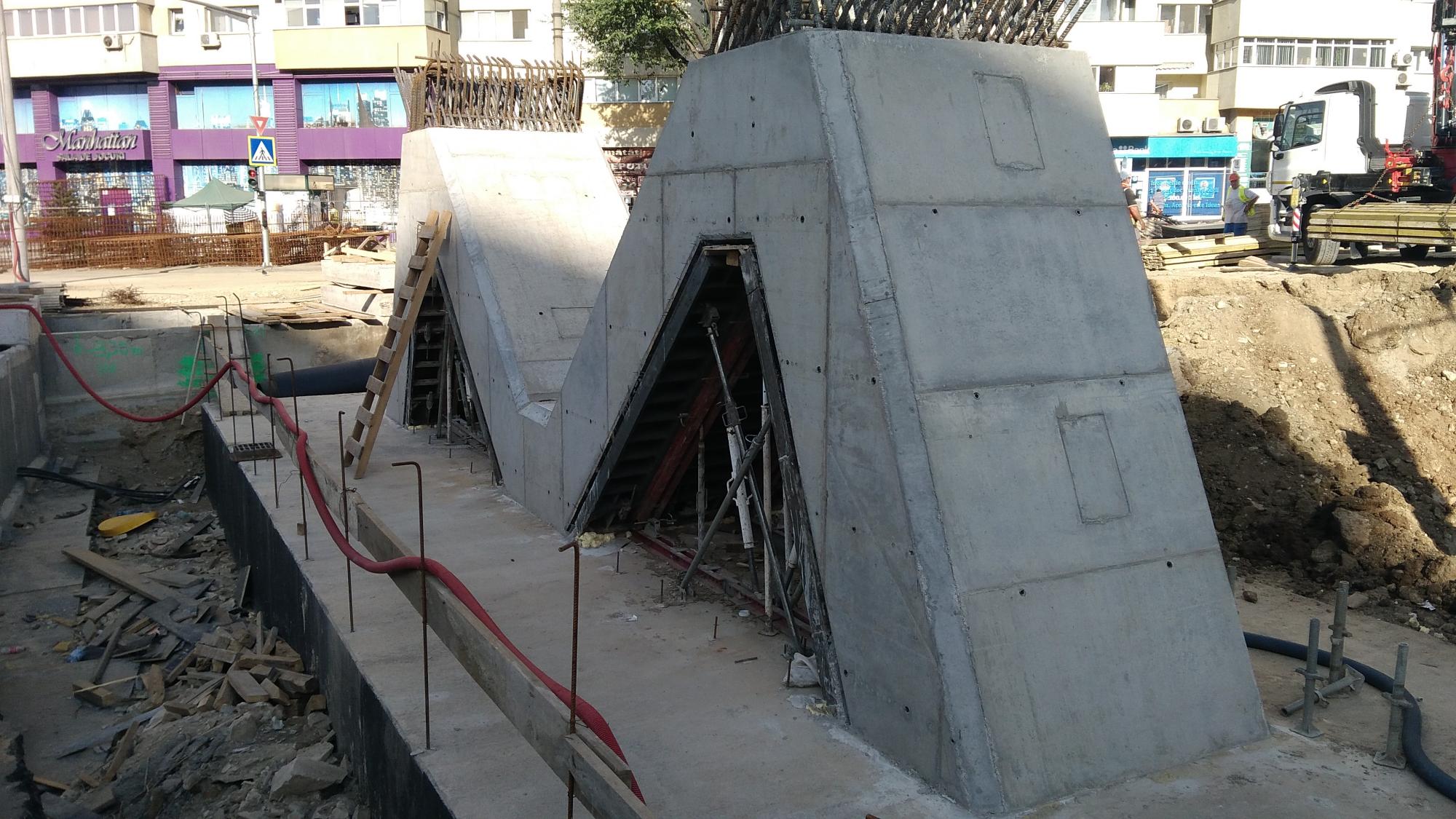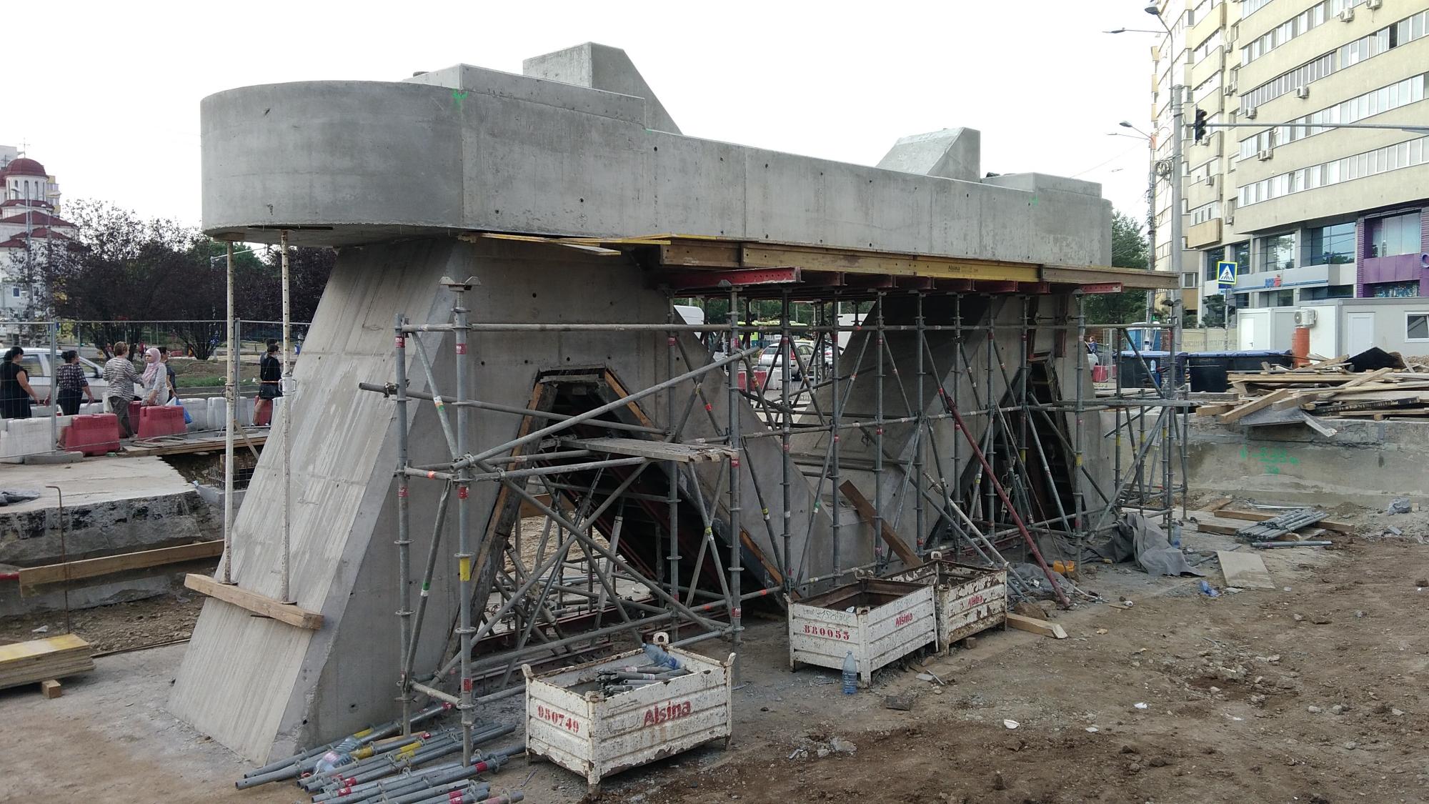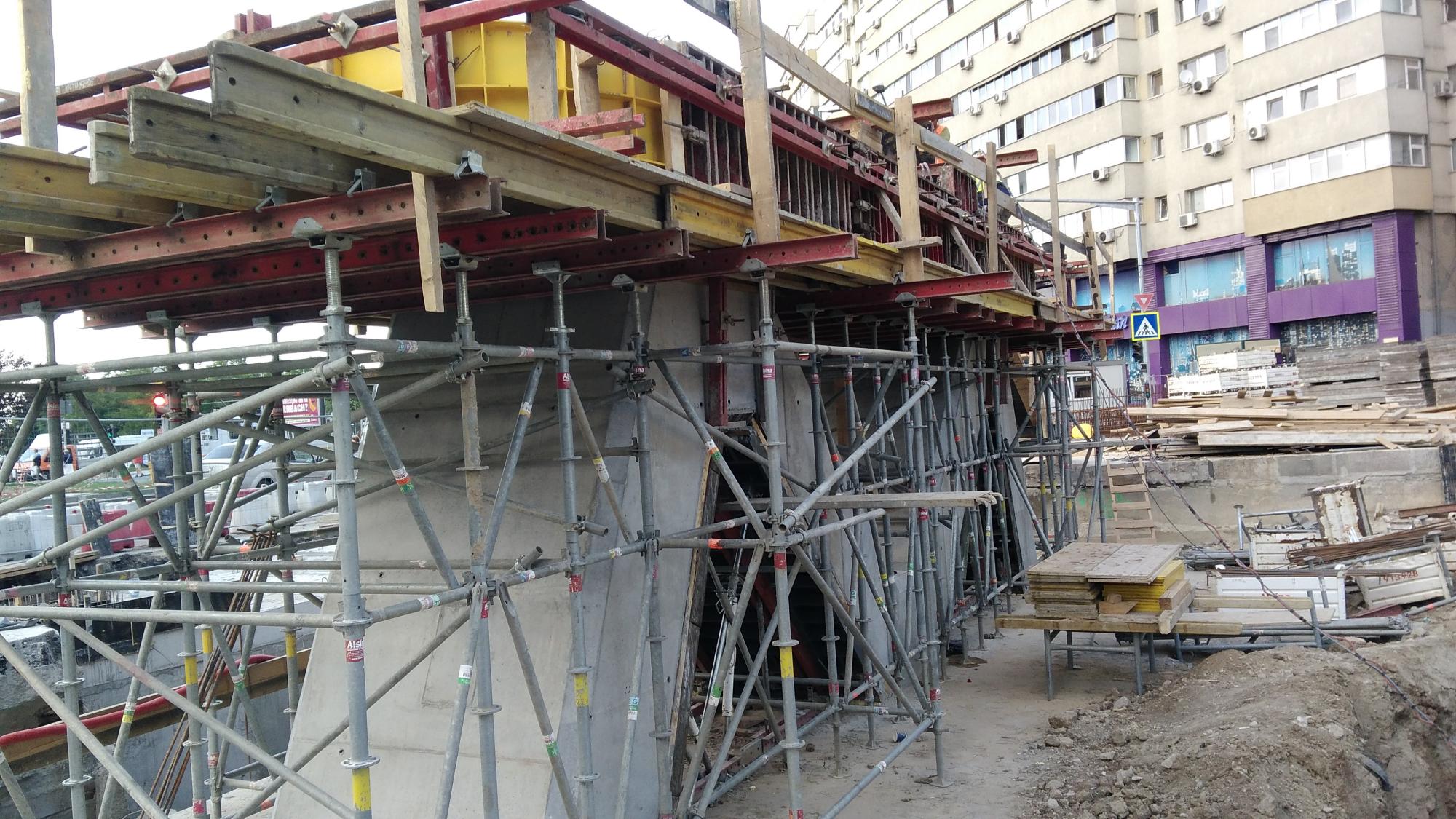 Avem 3 seturi a cate 2 fundatii pentru reazemele temporare ale grinzilor dintre culeea Tei si pila parc, probabil trebuie sa mai vina un set. Au pus si schele pe doua din seturi deci probabil trebuie sa vina reazemele.