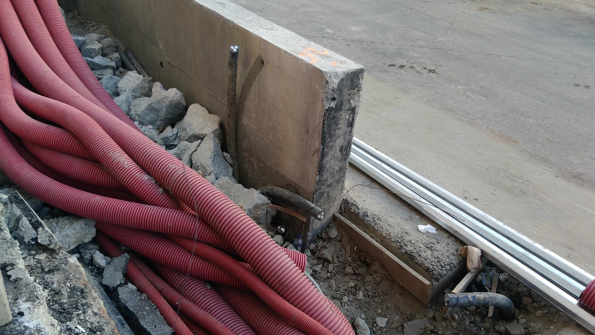 S-a betonat capul parapetului drept al rampei Delfinului, la parapetul asta mai sunt cofrate trei panouri, doua sunt la stadiul de armatura si unul este lipsa cu totul. Problema este ca prin zona panoului lipsa trec niste cabluri si prin alt panou trec tubulaturi ce par a fi Netcity pur si simplu prin carcasa de armatura! Ma gandesc ca vor fi inglobate in rampa...