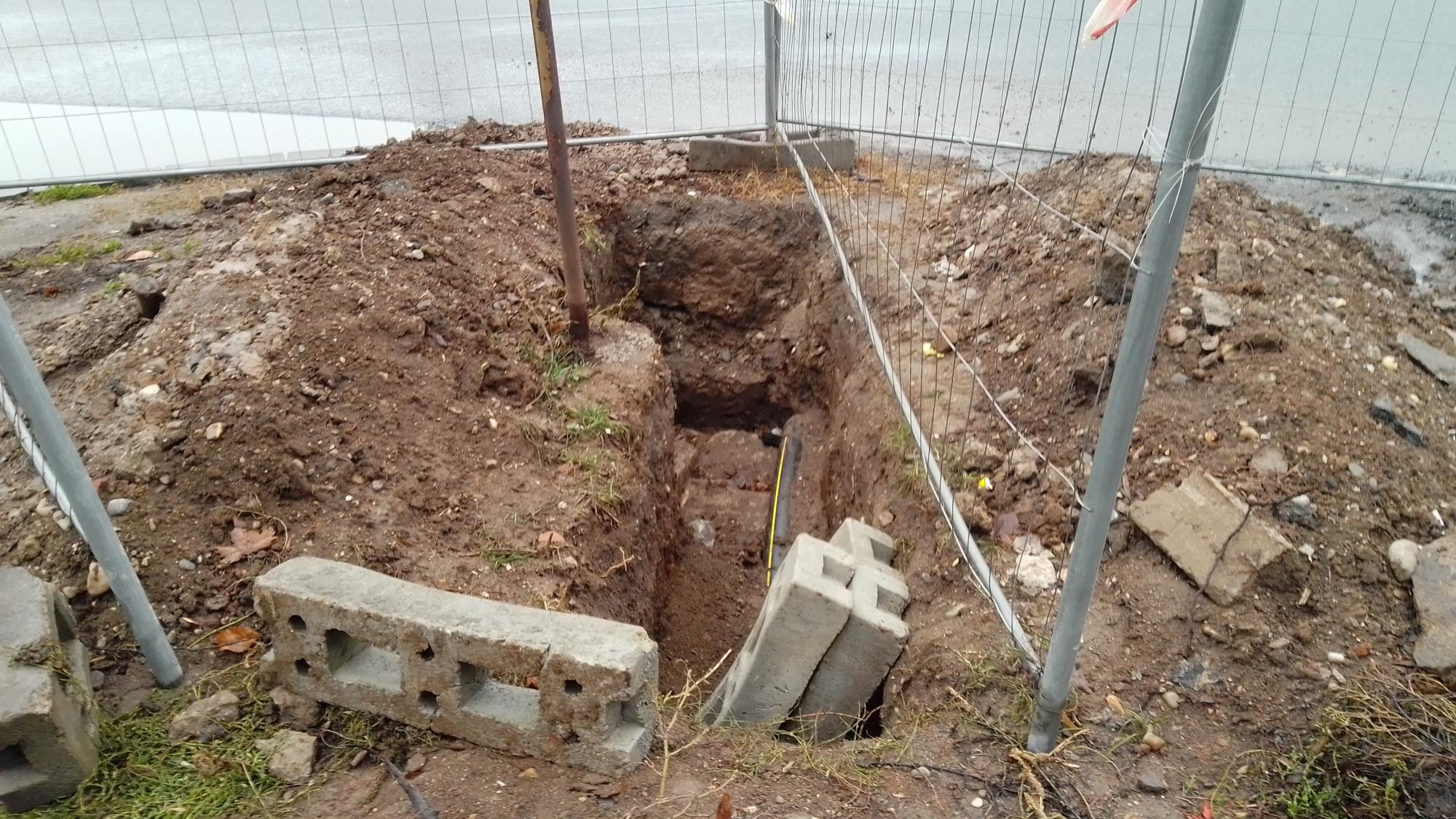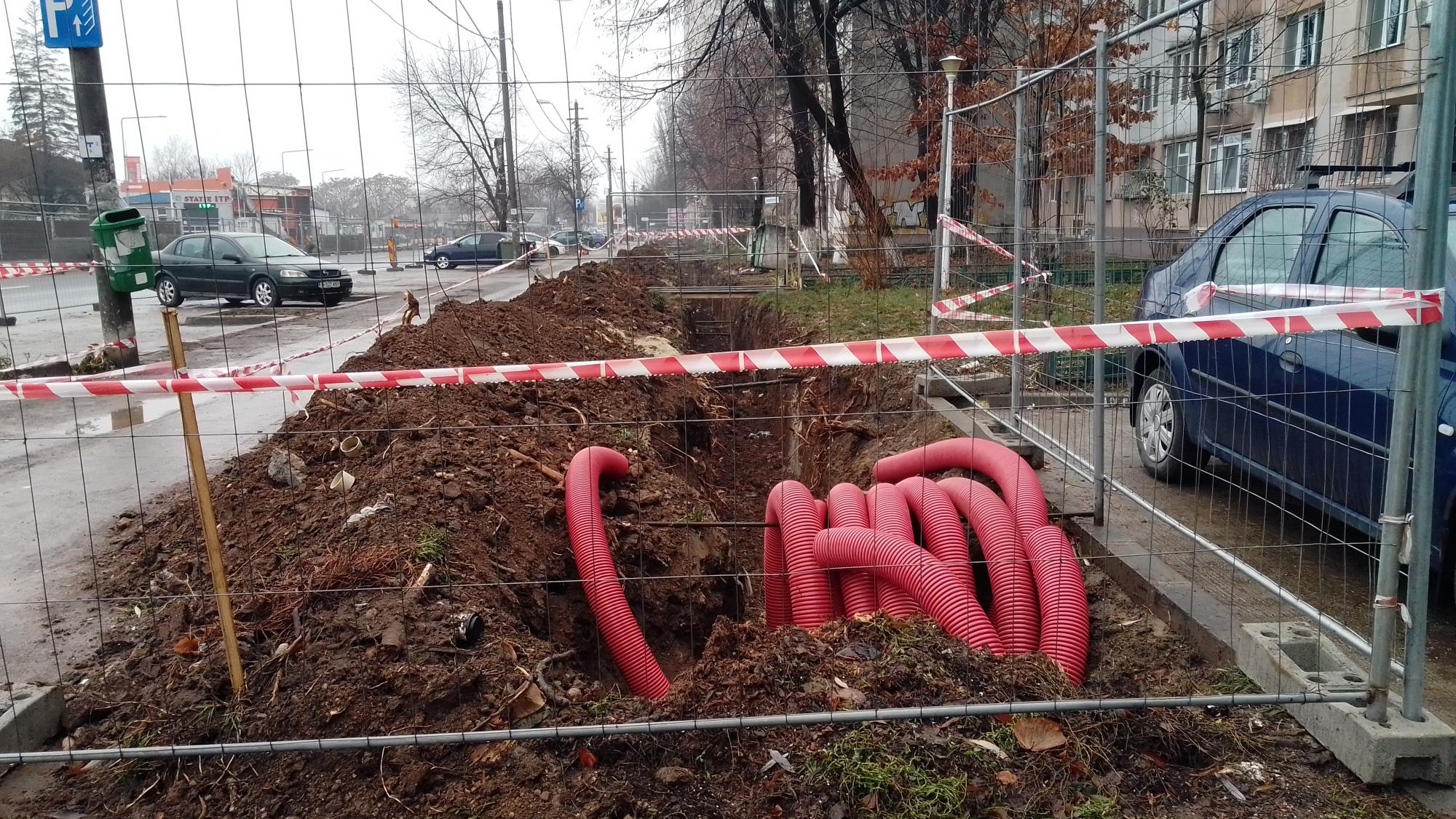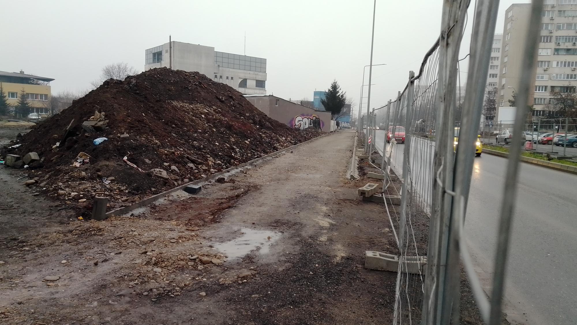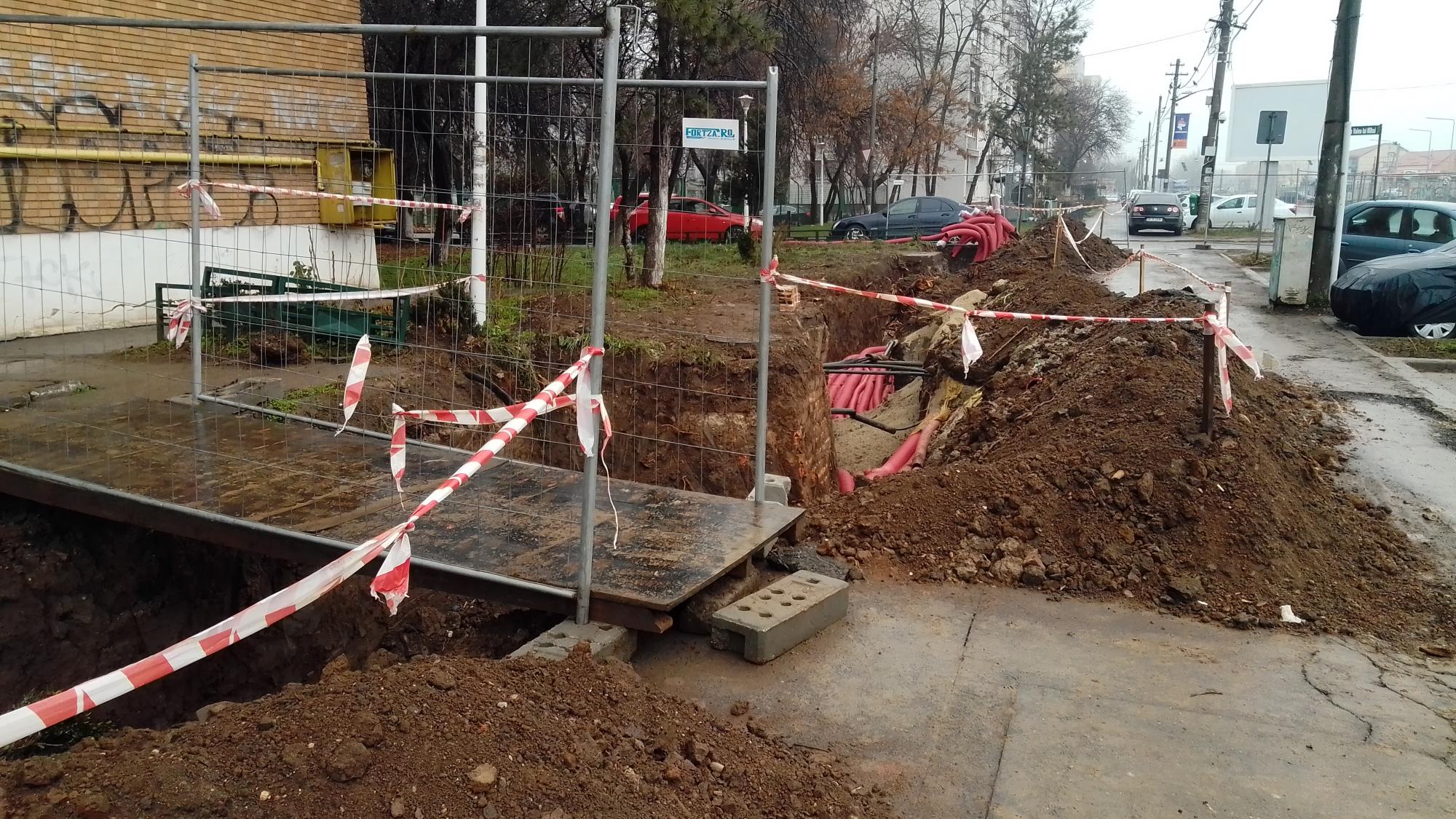 Pe partea blocurilor au mai sapata la santul cu copexul rosu, au ajuns pana la primul bloc de patru etaje, dupa care santul pleaca spre carosabil.