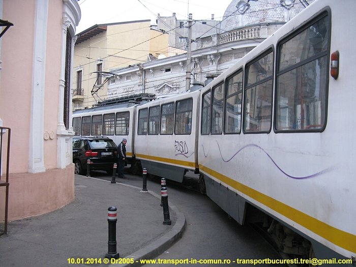 În curba spre Str. Ionel Perlea se află un BMW... vagonul trece, la 1 mm distanţă de oglinda lui: