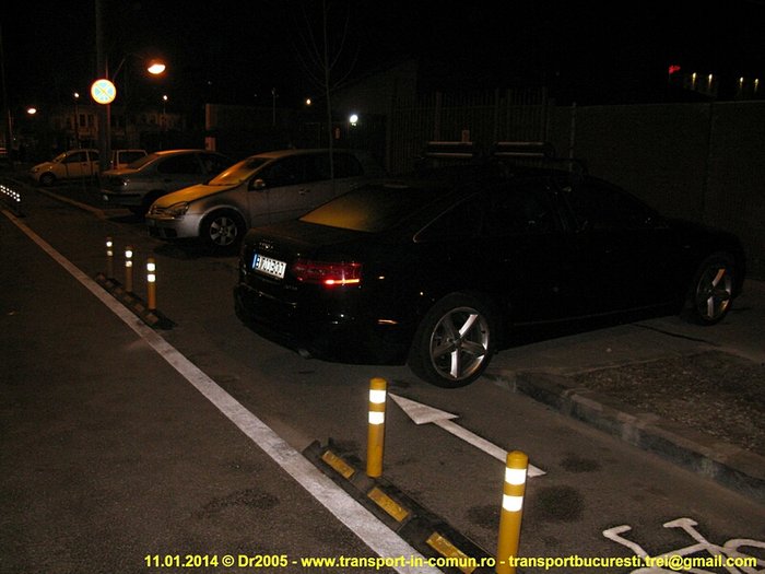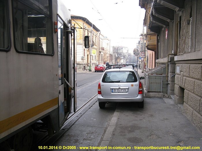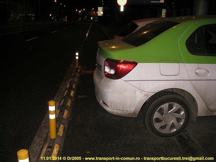 După intersecţia cu Bd. Alex. I. Cuza se opreşte... gărduleţele montate de Poliţia Locală intră în gabaritul liniei, fiind necesară mutarea lor cu mâna. Se observă şi cum se circulă: pe banda de biciclete sunt maşini parcate, pe banda I se stă cu avaria aprinsă (Skoda), pe banda II se circulă. Şi asta cu poliţia acolo!!!