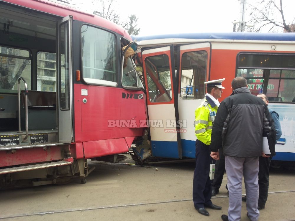 UPDATE 14:16 - "Cele doua tramvai au deraiat. Sunt patru raniti usor, din care trei femei si un barbat. Politistii fac cercetari la fata locului si urmeaza sa stabileasca imprejurarile in care s-a produs accidentul", a declarat Anca Vijiac, purtator de cuvant al Inspectoratului de Politie Judetean (IPJ) Iasi. Una dintre ipotezele politistilor este ca accidentul s-a petrecut din cauza unei defectiuni tehnice aparute la unul dintre tramvaie. Se pare ca tramvaiul a "scapat la vale", in timp ce urca o panta.