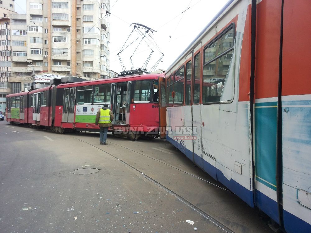 UPDATE 14:16 - "Cele doua tramvai au deraiat. Sunt patru raniti usor, din care trei femei si un barbat. Politistii fac cercetari la fata locului si urmeaza sa stabileasca imprejurarile in care s-a produs accidentul", a declarat Anca Vijiac, purtator de cuvant al Inspectoratului de Politie Judetean (IPJ) Iasi. Una dintre ipotezele politistilor este ca accidentul s-a petrecut din cauza unei defectiuni tehnice aparute la unul dintre tramvaie. Se pare ca tramvaiul a "scapat la vale", in timp ce urca o panta.