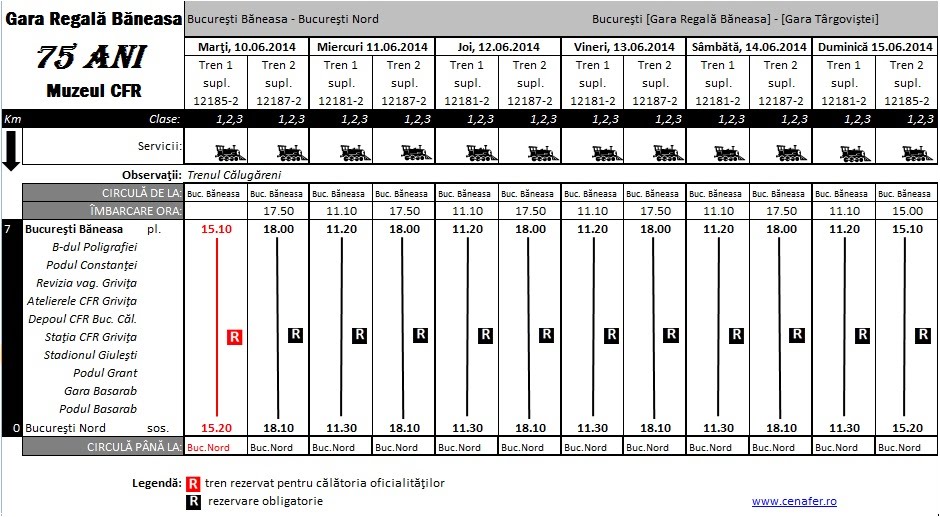 TRENUL CĂLUGĂRENI: va circula zilnic, în perioada evenimentului, pe relaţia Bucureşti Nord - Bucureşti Băneasa, 2 curse pe zi.
