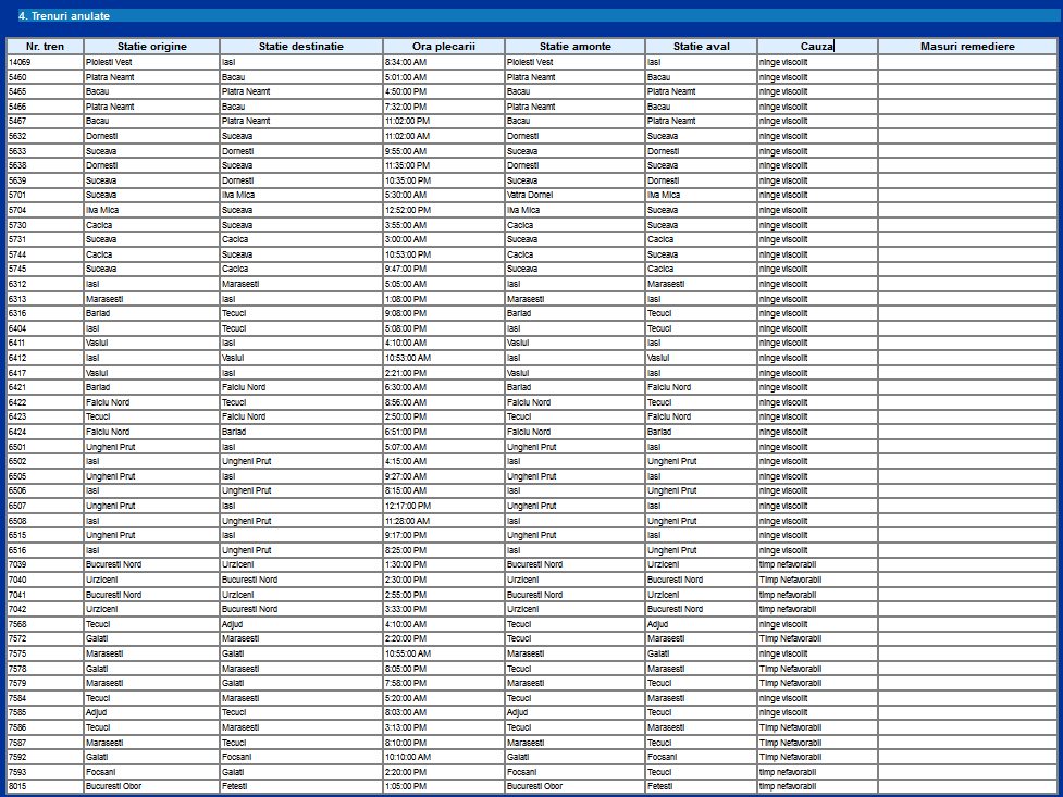 Nr. tren Statie origine Statie destinatie Ora plecarii Statie amonte Statie aval Cauza Masuri remediere