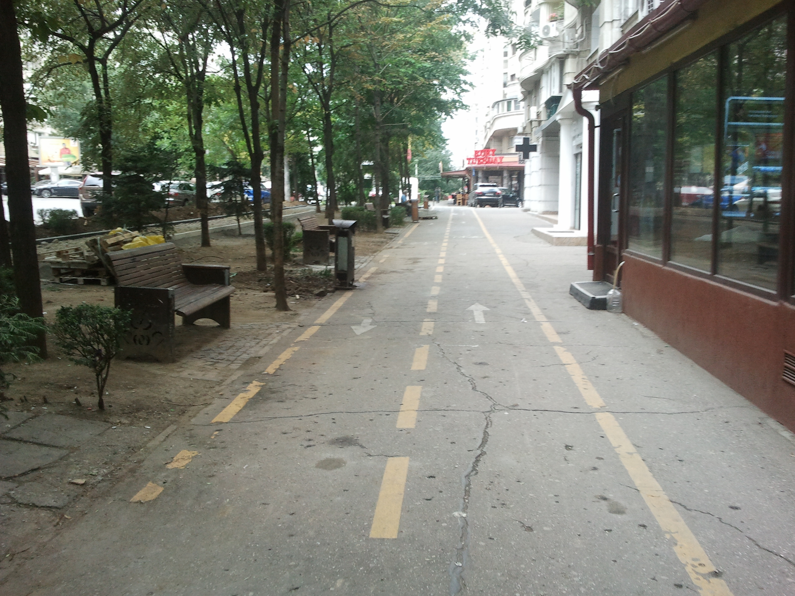 Trotuarul convex fara canalizare si iluminat, pentru a nu deranja ambientul luminos propriu folosit de fiecare birt si bodega din paterul blocurilor in parte.