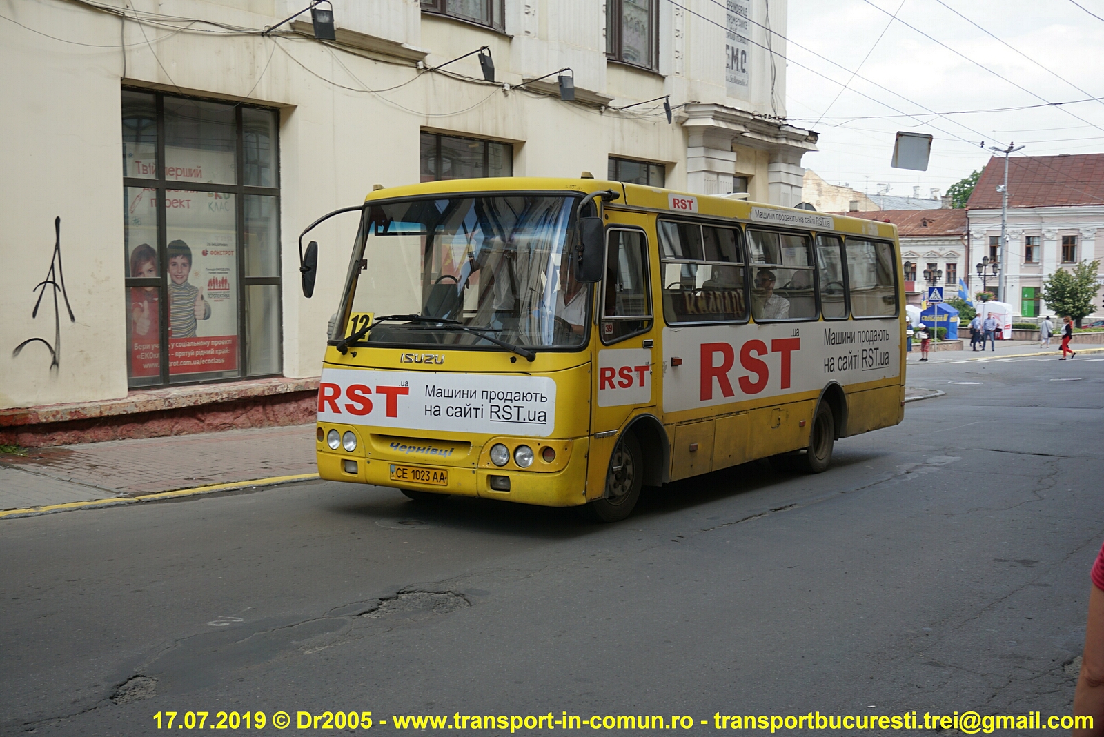 Bohdan А-092Н2 CE 1023 AA (fab. 2012), operator Т ,,Cernivţi 2004", linia 12, pe Str. Universitets'ka, mergând spre Magazin Kolos