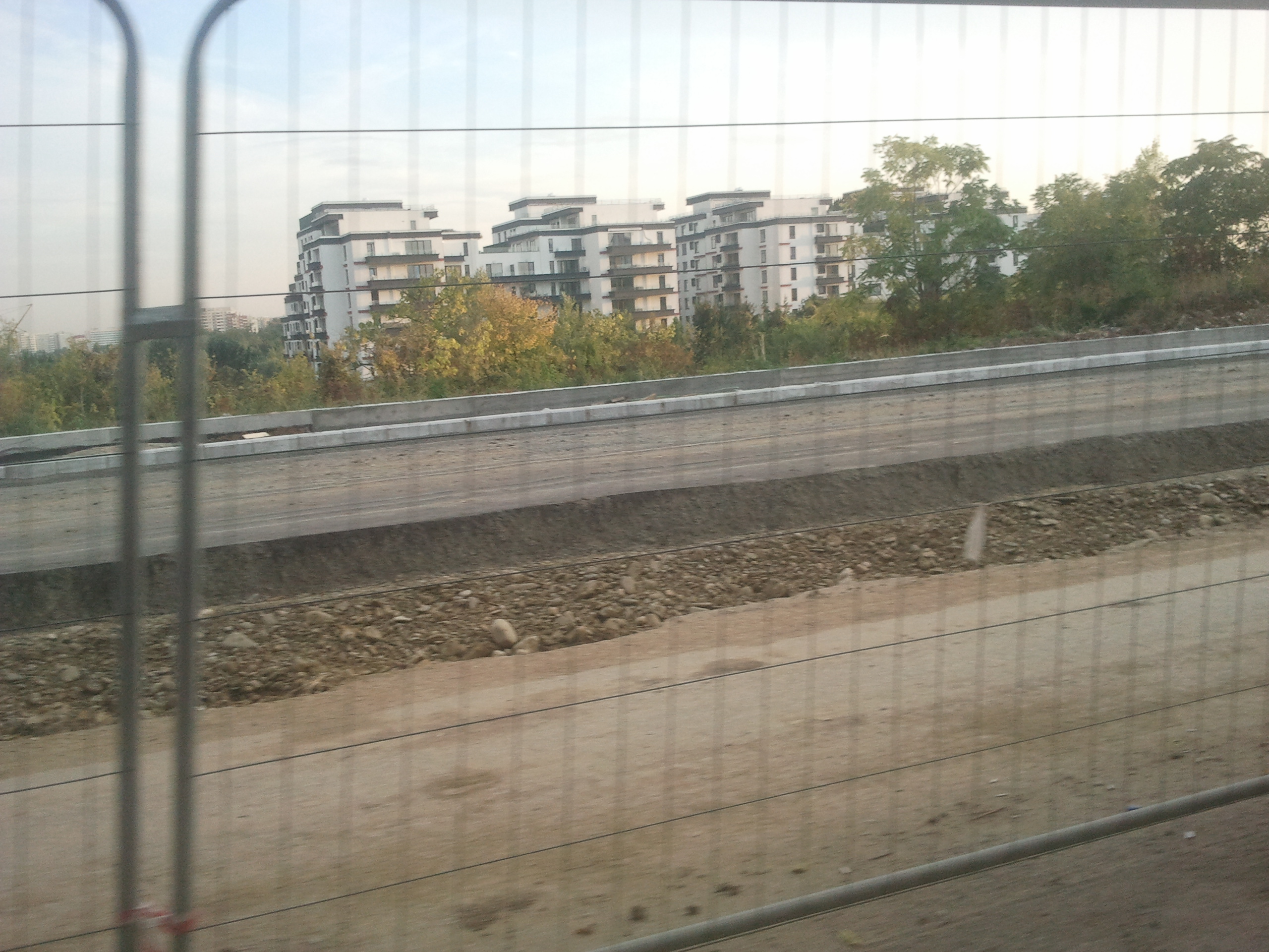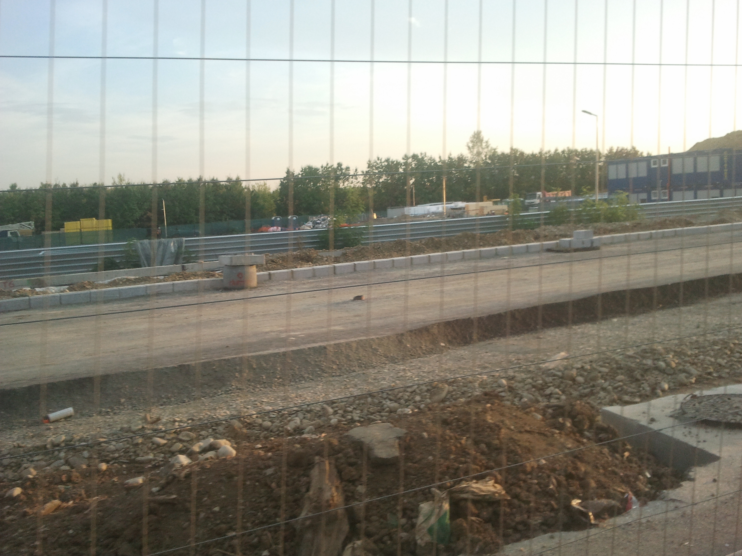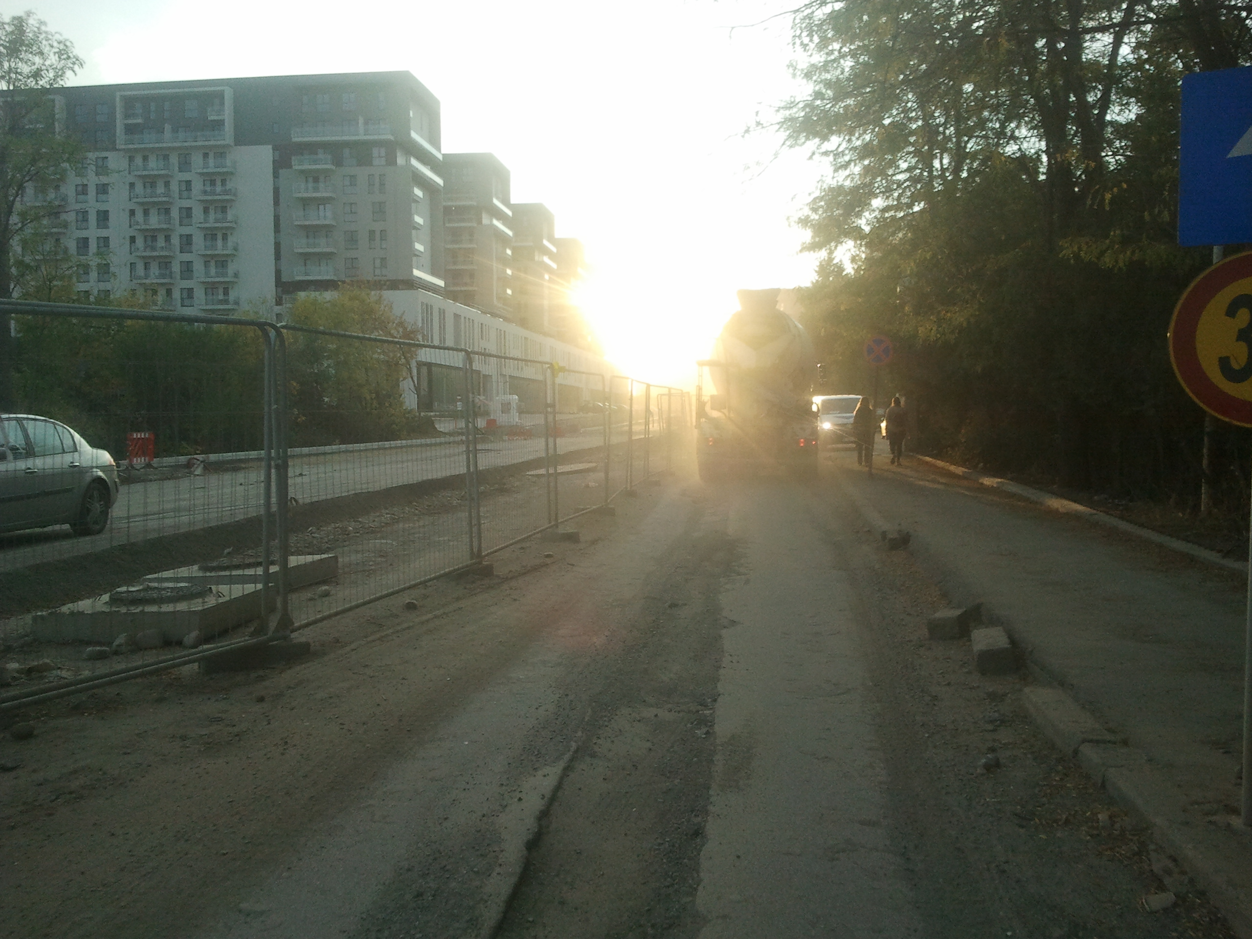 Totusi azi am zis sa profit de ora de varf si de sensul unic pe o singura banda instaurat si sa incerc cateva poze. Carosabilul este de nedescris, gropi peste gropi, praful noriul uscat si molozul sunt la ele acasa, orice basculanta, orice betoniera trece ridica un nor dens de praf care poate bloca chiar si jumatate din lumina directa a soarelui. Cei care circula cu masinile pe aceasta ingustare curenta sunt cu siguranta maestri in masochism, oricat de confortabil ar fi automobilul in cauza. Practic dintr-un kilometru iesi cu masina ca si cum ai fi mers pe camp prin tot colbul.