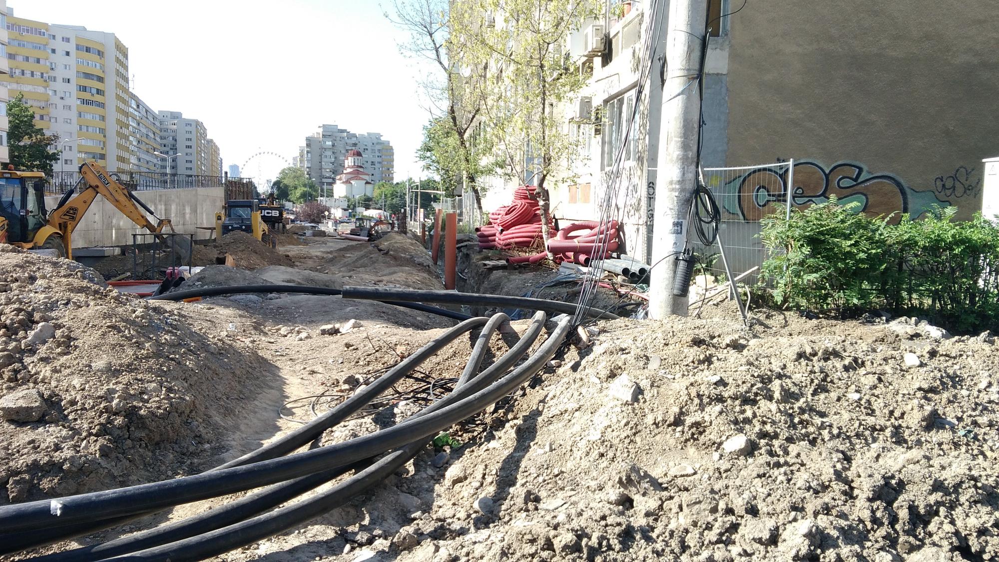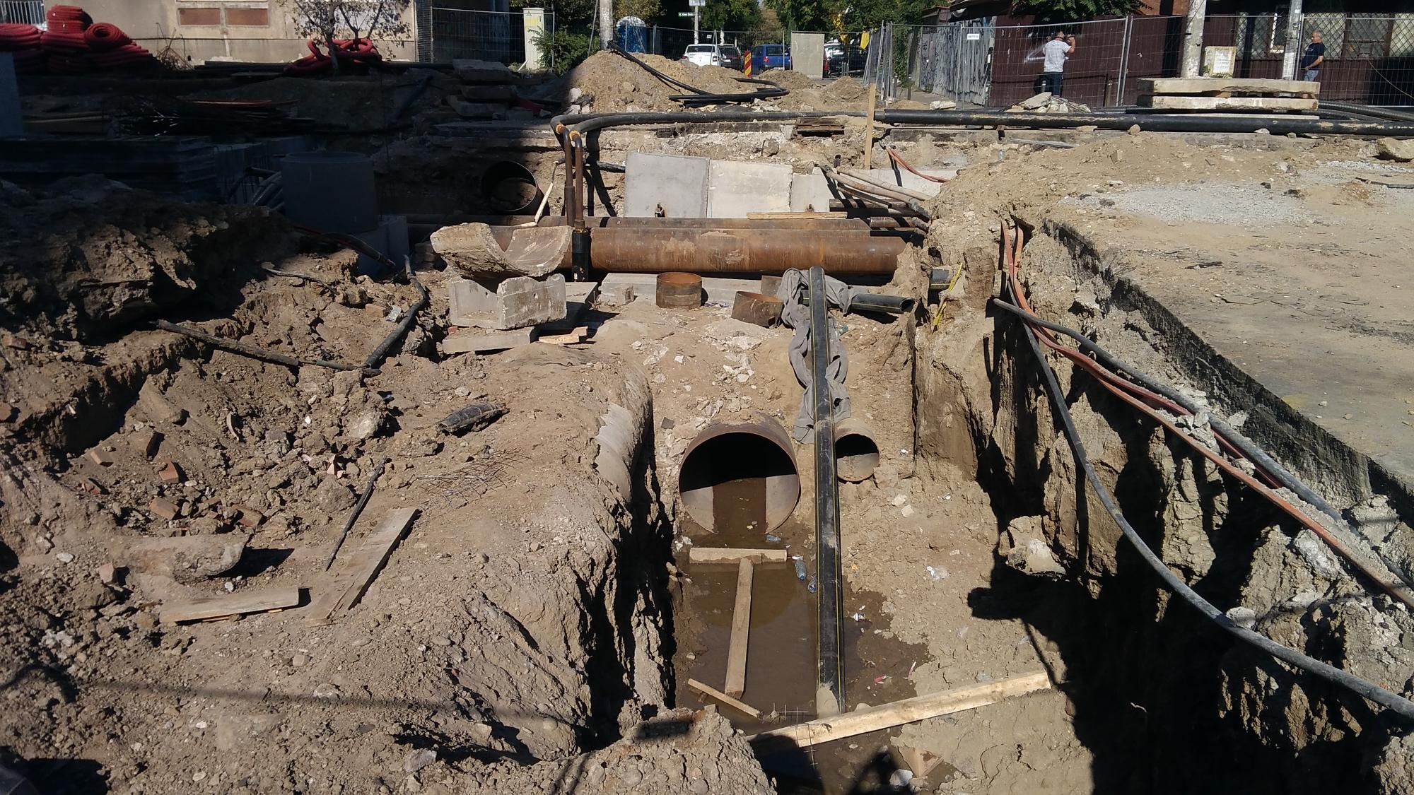 Santul cu de toate dintre Str. Sinaia si Sos. Gherase, de notat ca teava de gaz a fost suprimata, are dop pus, undeva sub limita de jos a imaginii. Se observa in fundat zona unde trebuie sa se intepe racordul de termoficare pentru blocurile de pe partea Sos. Gherase in magistrala noua.