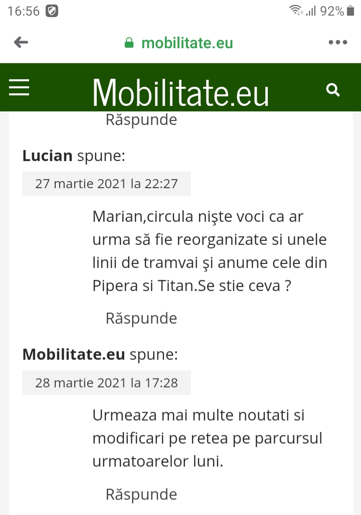 Lucian scrie:Circula voci cum ca liniile de tramvai din Pipera si Titan ar urma să fie reorganizate.Mai multe nu stiu deocamdată