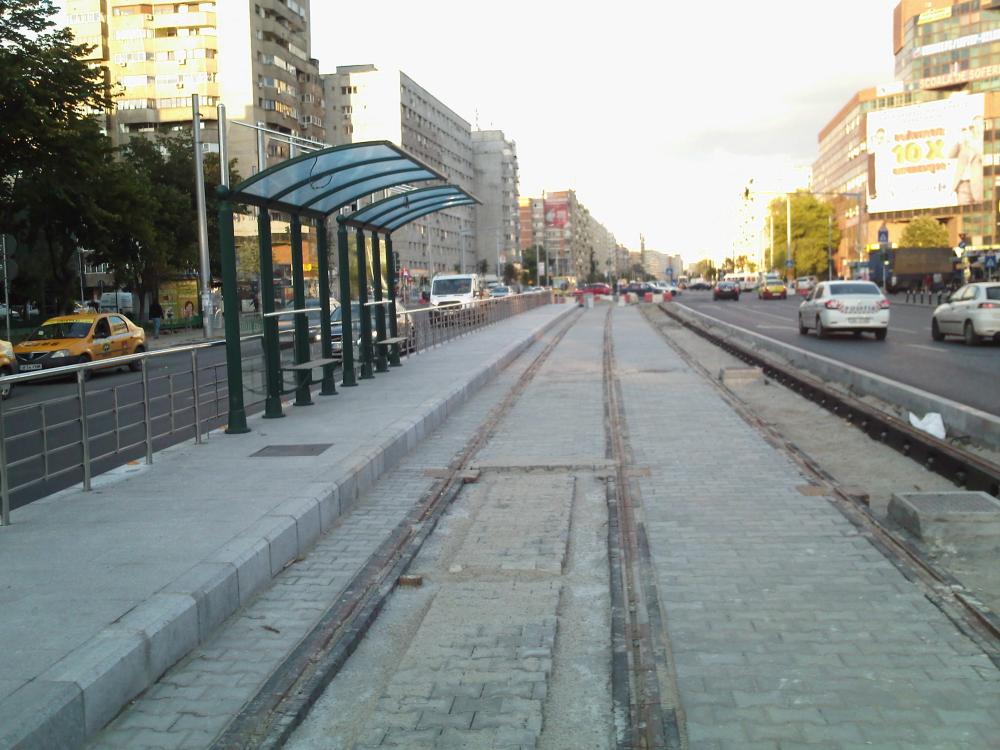 Refugiul de tramvai de la Spital, sens spre Fundeni. Vedere spre Granitul. Pavajul este gata, lipsesc inca detalii precum copertinele.