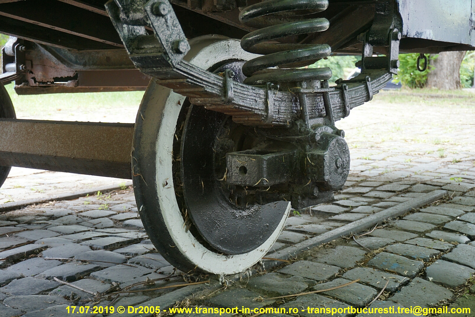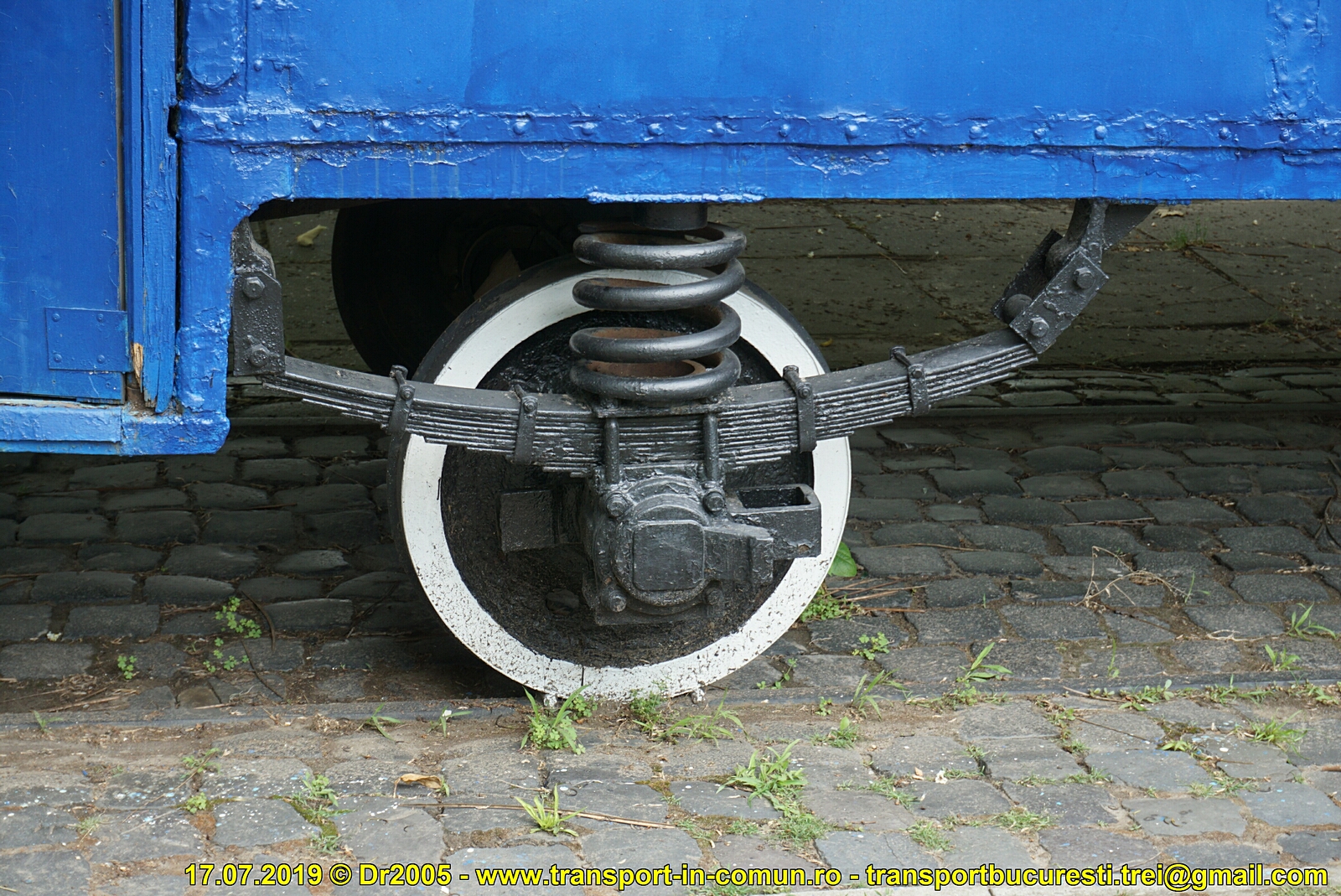 Vagonul are două osii, cândva motoare, doar că motoarele, contactoarele şi rezistenţele de demaraj/frânare au fost îndepărtate: