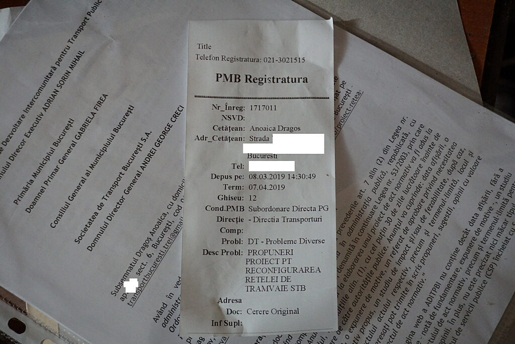 Am trecut şi eu pe la Registratura Generală a PMB şi am lăsat o hârtiuţă. Am transmis nişte faxuri şi la S.T.B., la Cabinet Primar General plus un e-mail la ADITPBI, care nu are nici fax, nici Registratură.