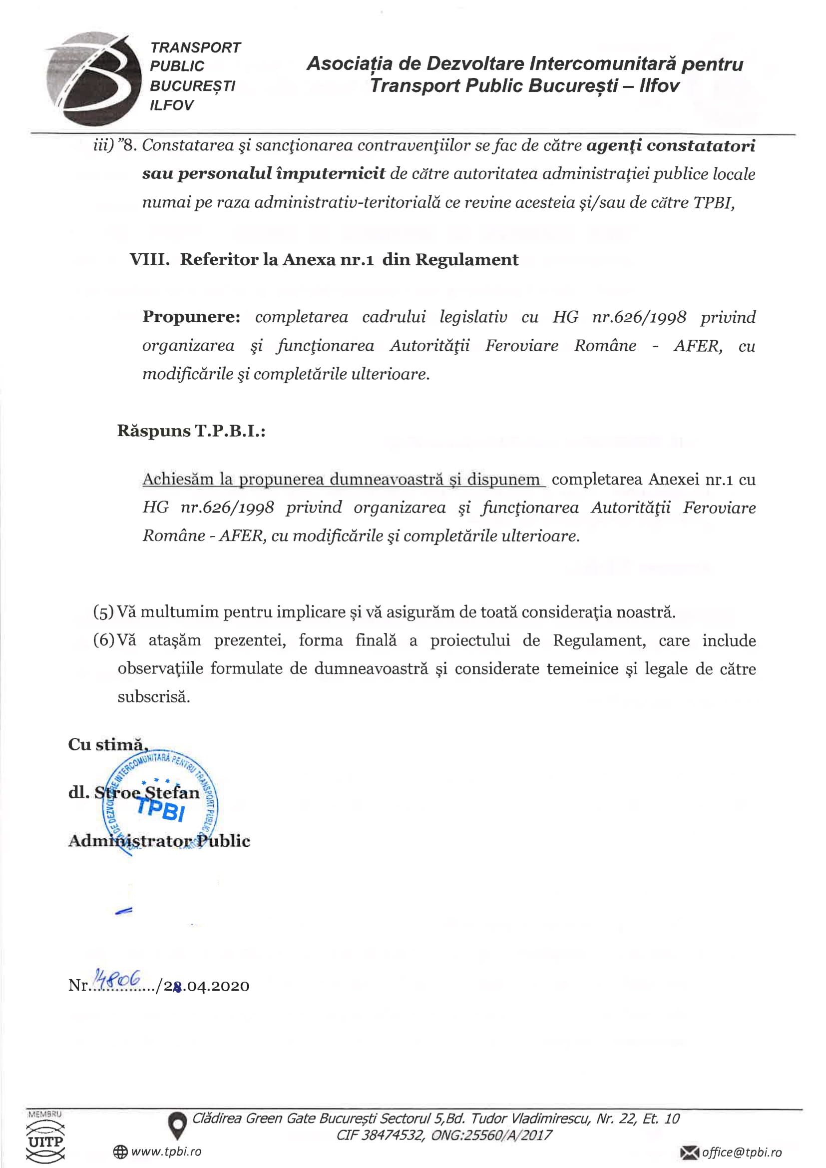 Ref.: Propuneri privind „Regulamentul serviciului de transport public de călători în Regiunea București-Ilfov”