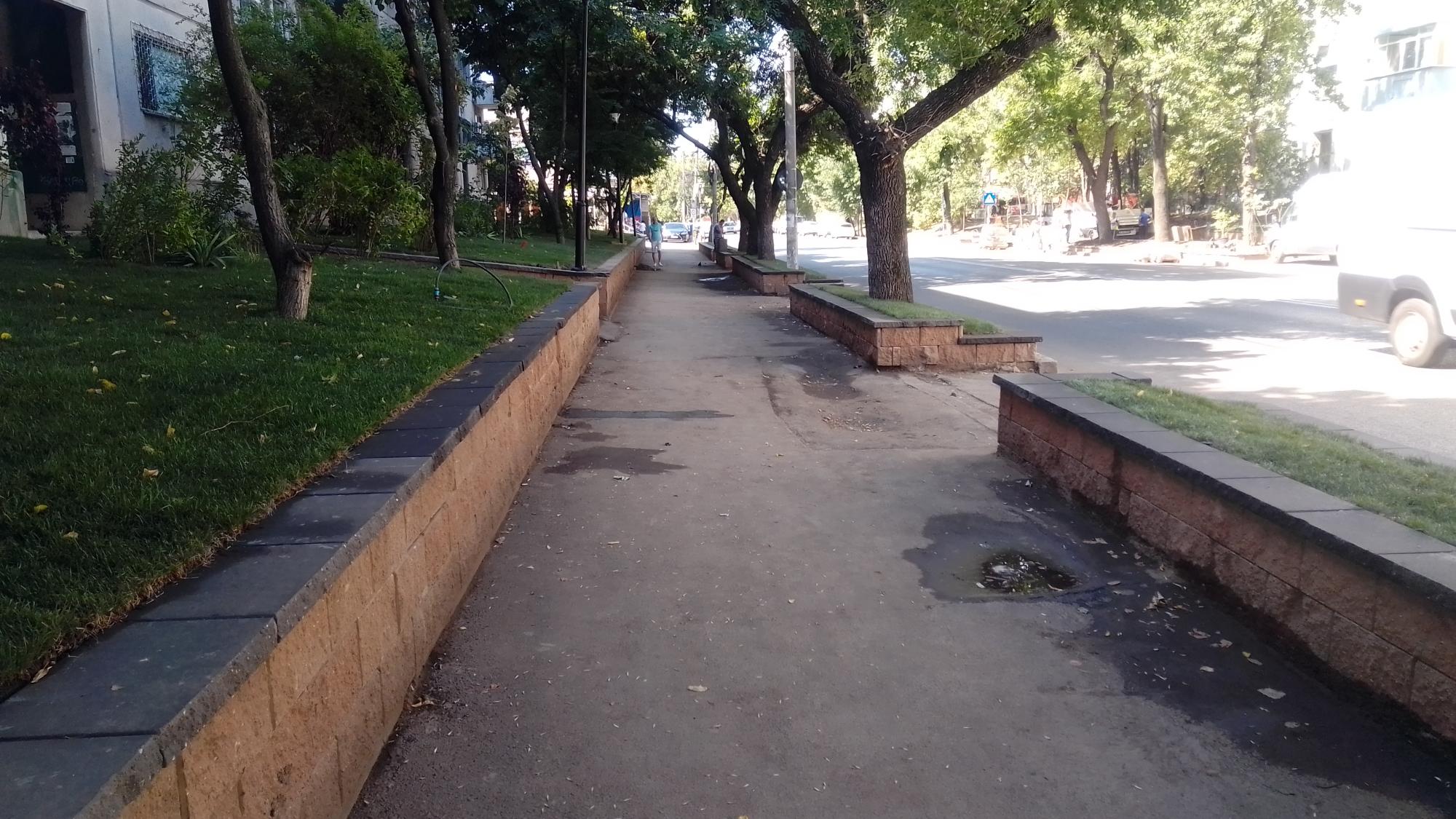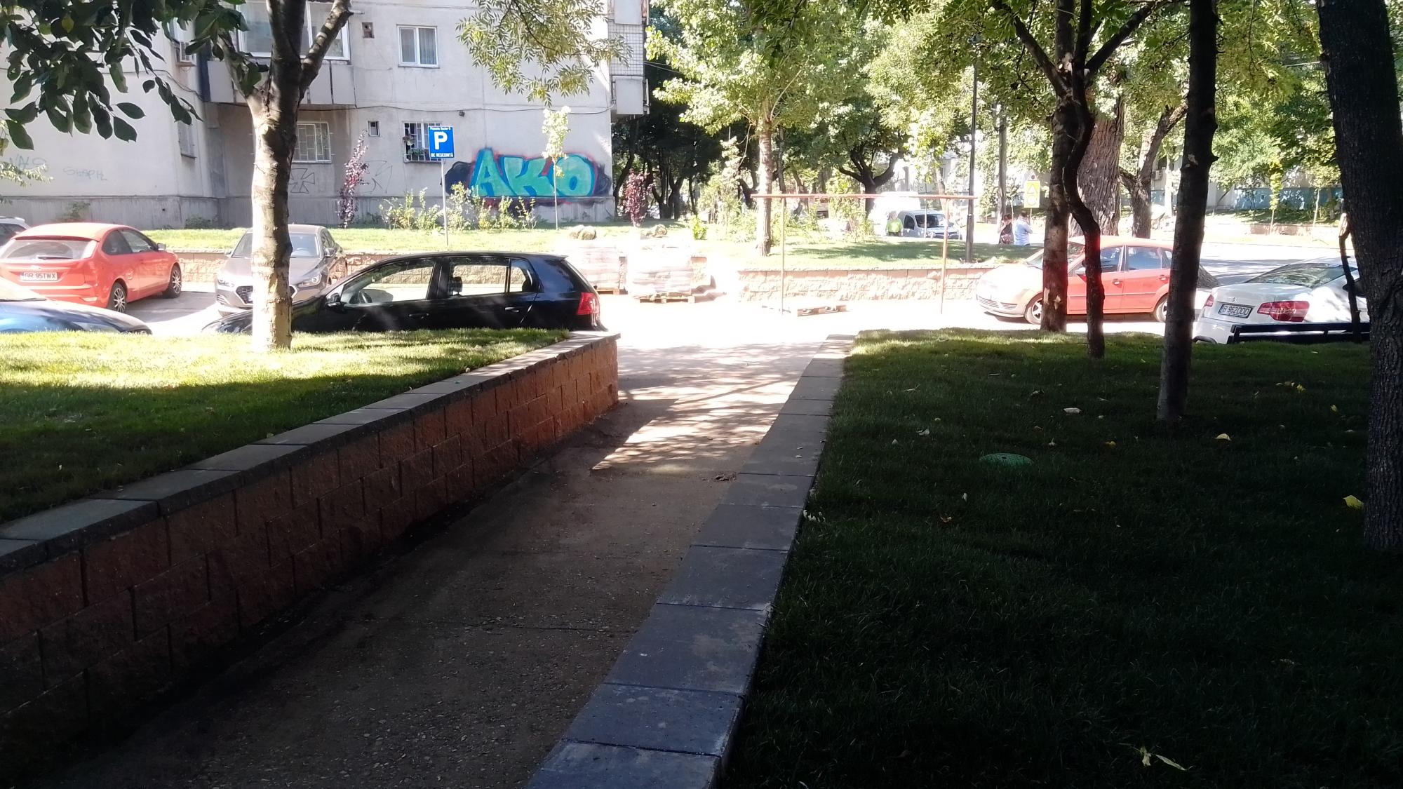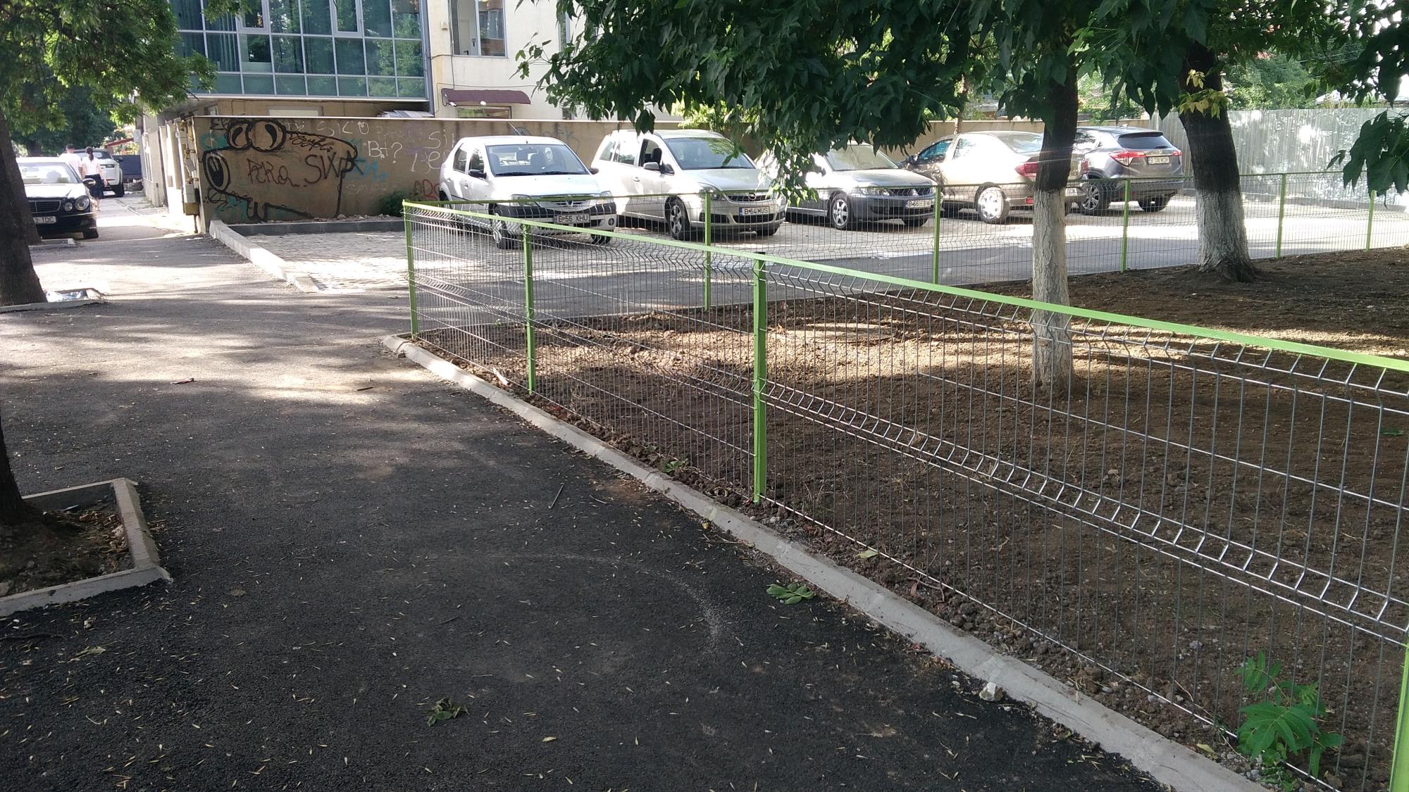 Proaspetele edificii pedoniste: gardutul de plasa sudata ambutisata, borduricile si asfaltul compactat cu bocancul. Alinierea, aplecarea si tuguiati buzele dragilor asa cum a predat dom' profesor la latrina3, ca vine circo belluci in "inspectie".