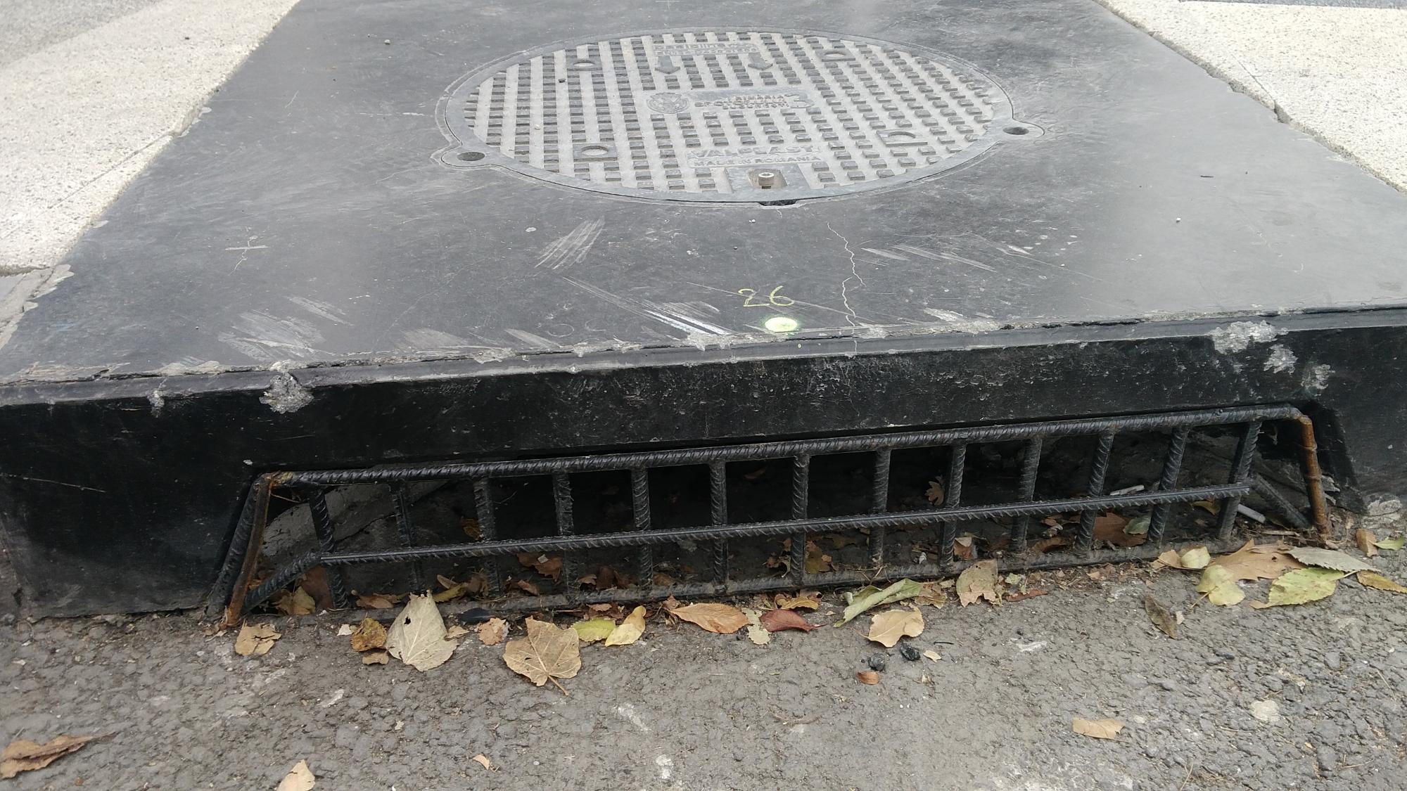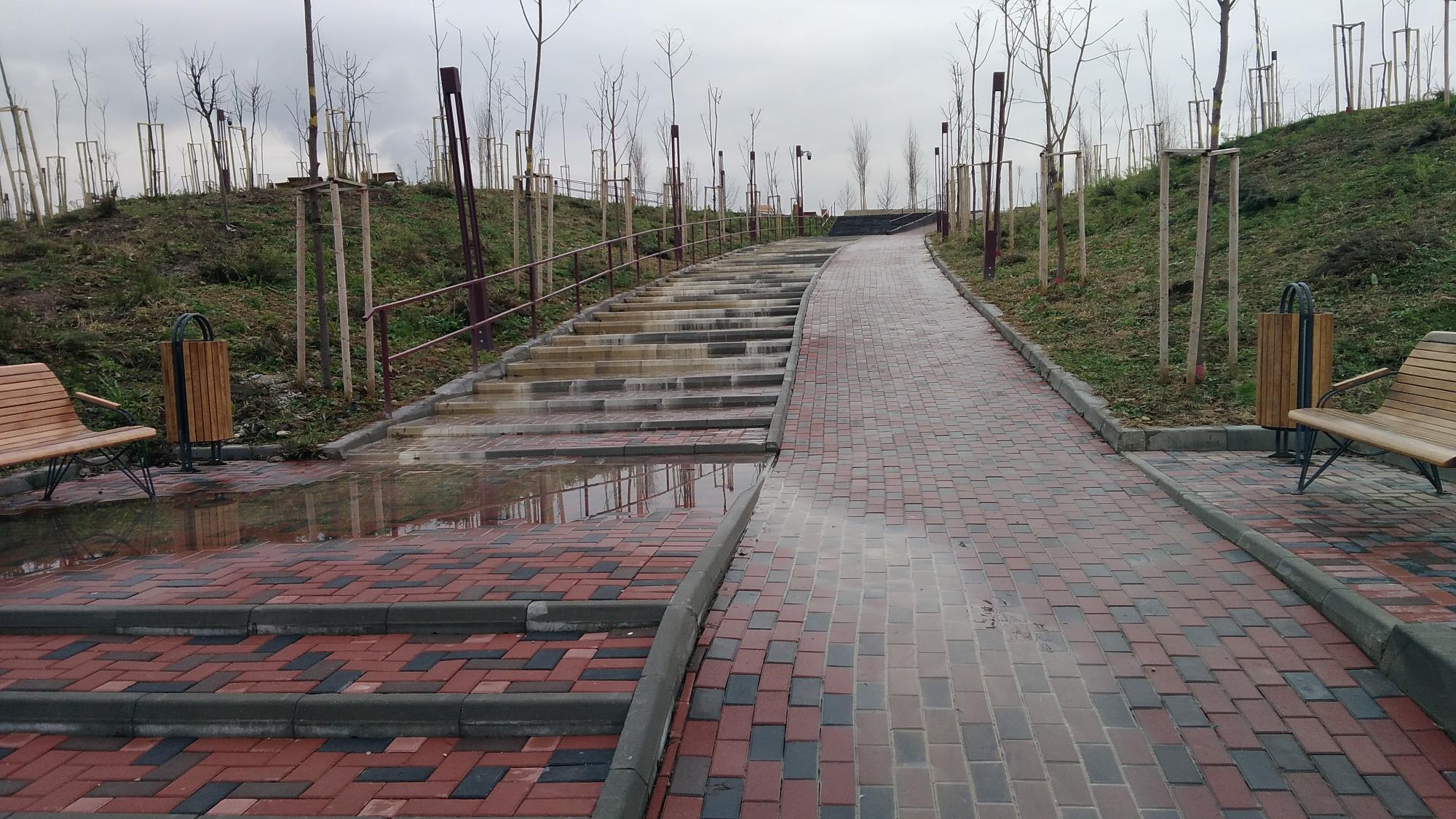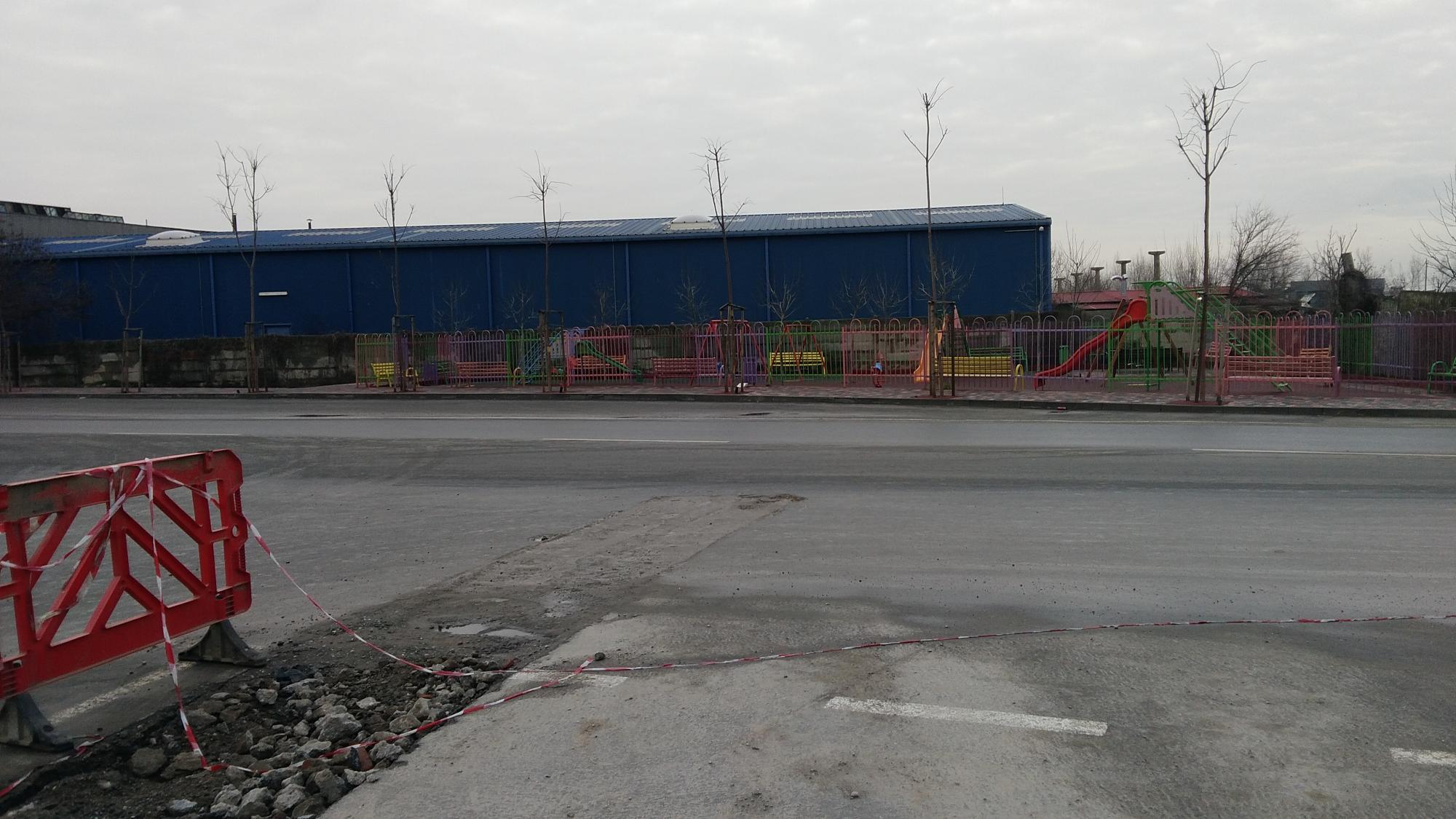 La alveola in fronturile stradale de blocuri suprastructura care nu s-a mai facut peste accesul auto nordic a lasat locul unui frumos platou de beton denivelat fata de trotuar. Destul de sinistru.