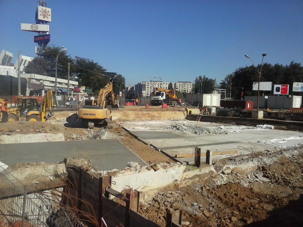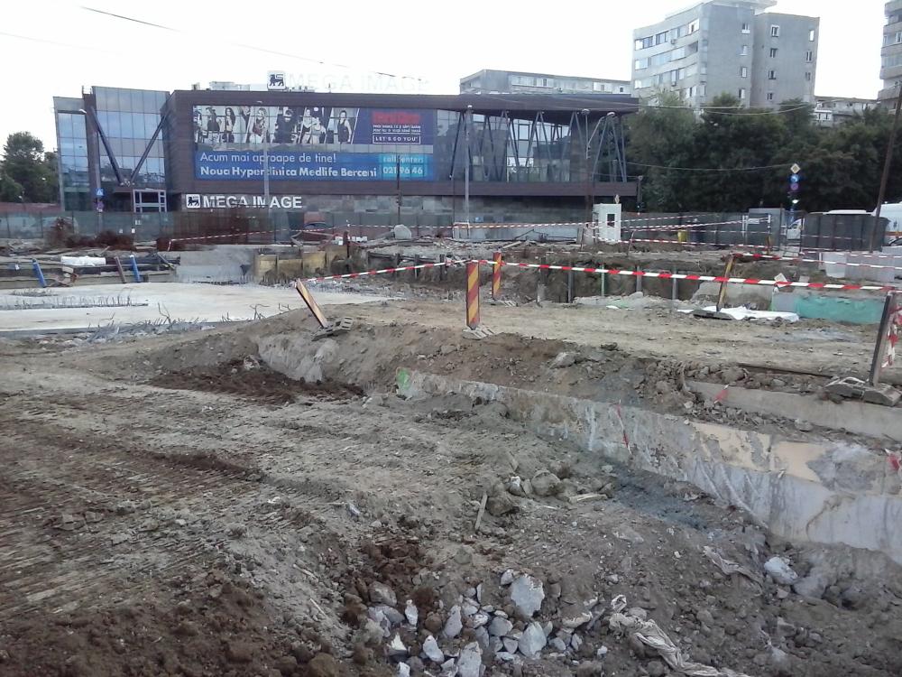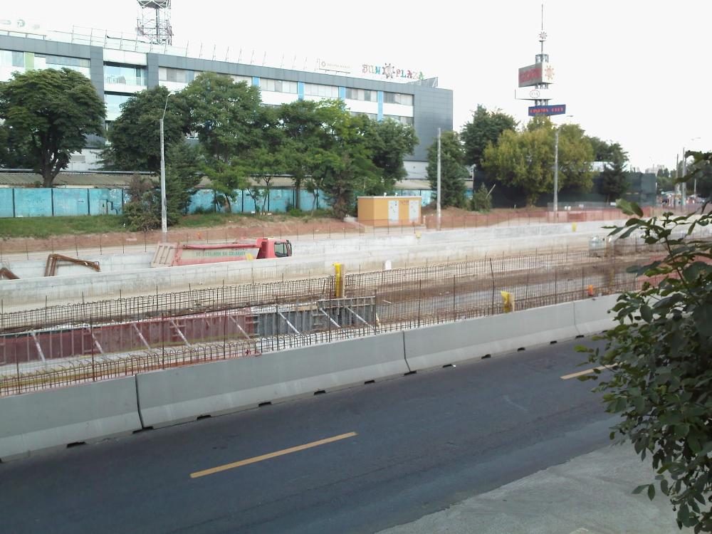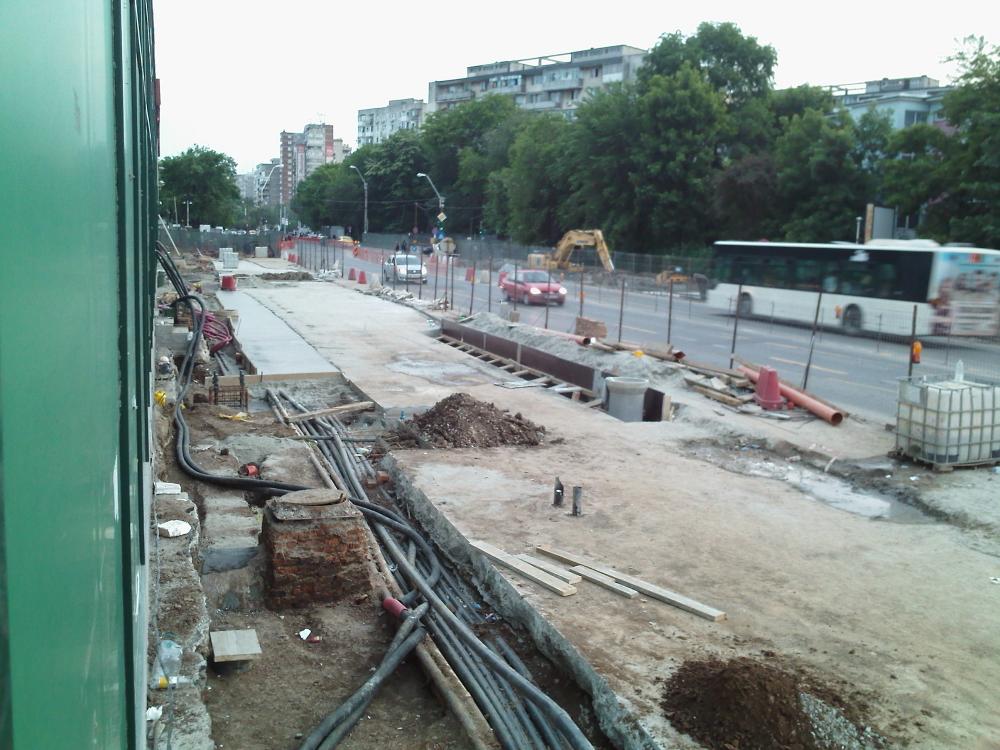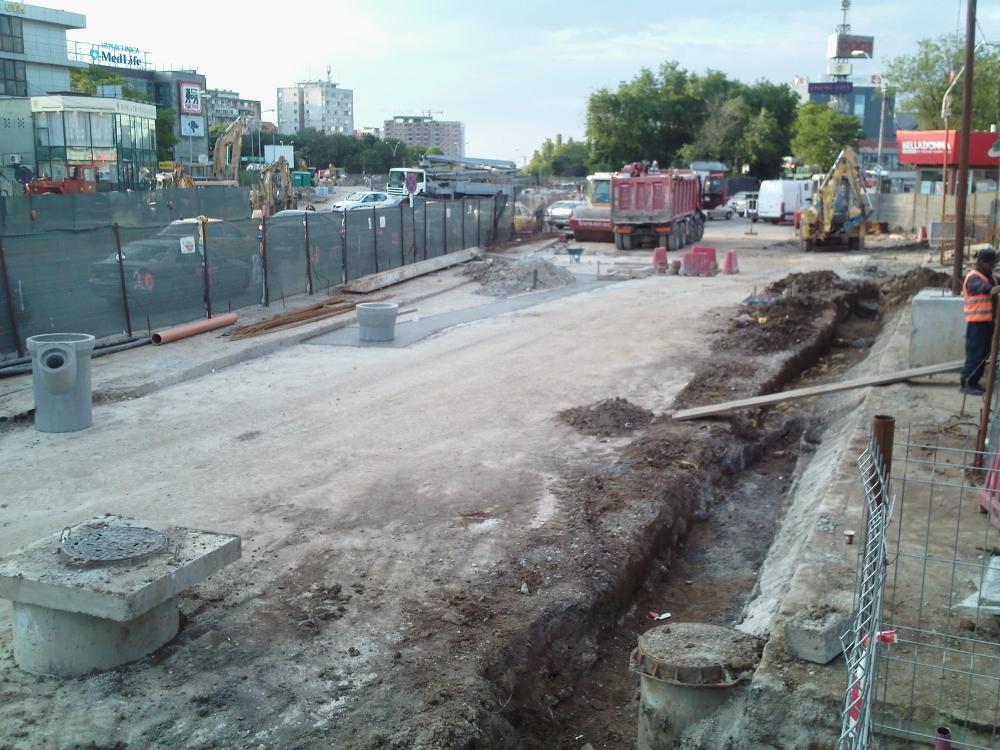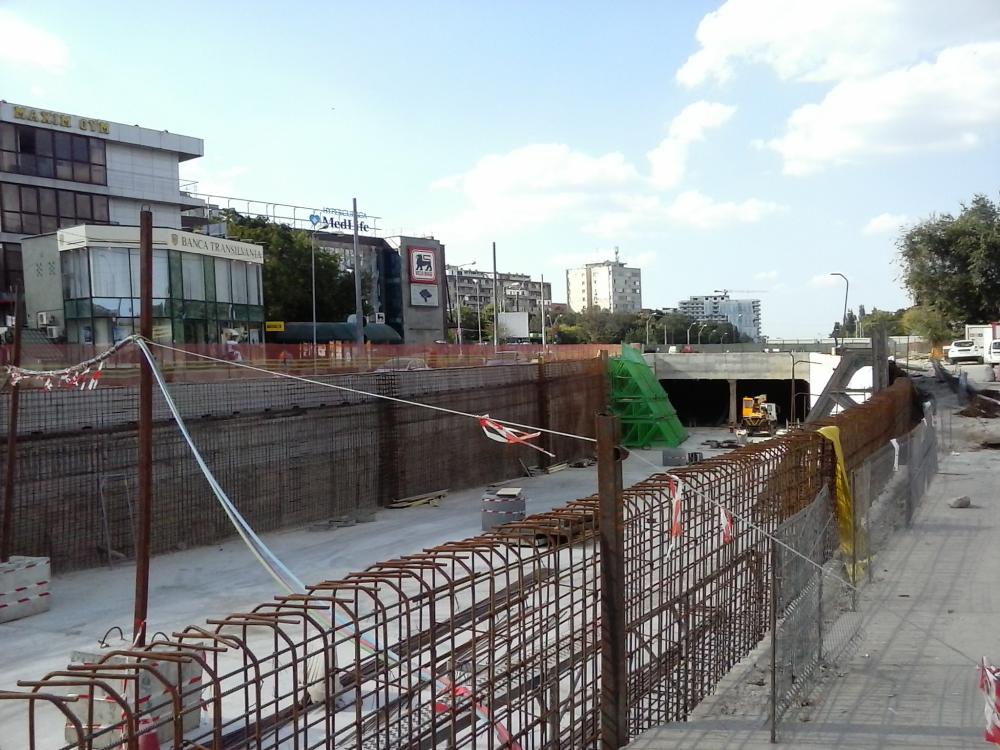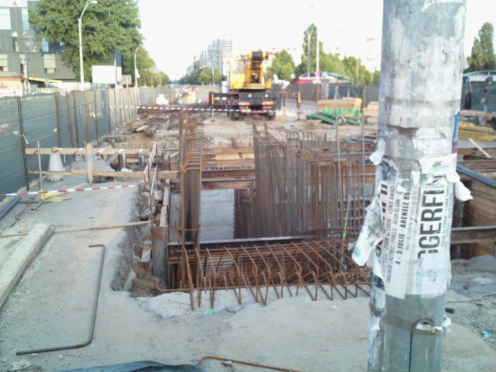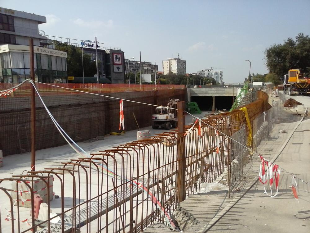 9. Pasajul pietonal 3 (PP3) de conexiune a refugiilor de tramvai cu pasajul pietonal metrou-Sun Plaza are zona de culoar executata si acoperita, in prezent circulatia auto este mutata peste, sunt executate foraje si s-au introdus o parte din profilele metalice in zona de subtraversare a liniilor de tramvai (in prezent desfiintate), in vederea excavarii.