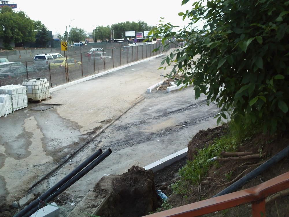 Zona de varsare in soseaua Oltenitei a bretelei de pe Vacaresti pe langa rampa de intrare in pasaj, trecuta peste planseul PP1. In stanga mea este benzinaria. Betonata pana in parapetul care delimiteaza portiunea neatacata din PP1, pe unde acum se desfasoara circulatia auo.
