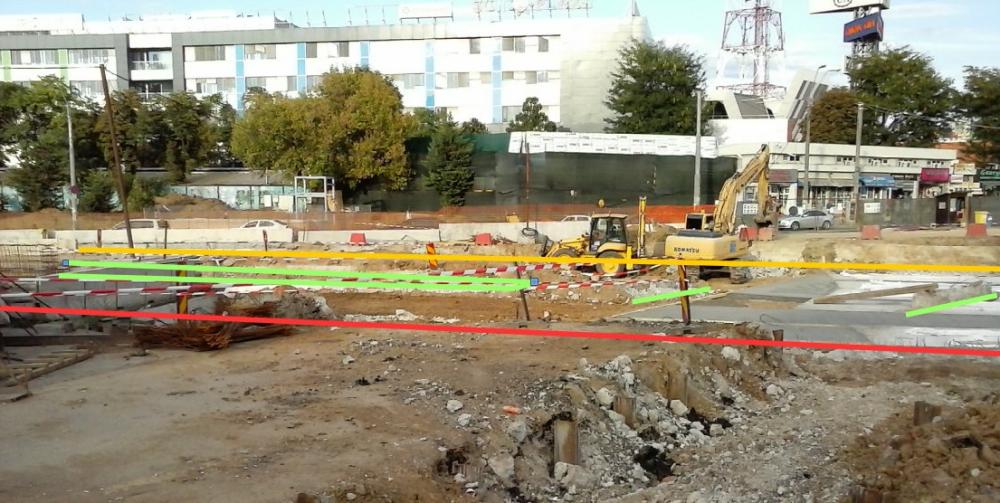 5. Pasajul pietonal 1 (PP1) este excavat si are radier+pereti+planseu betonate in zonele cu linie continua, executate acces MegaImage+acces refugiu tramvai spre IRA+acces benzinaria Mol. Zona cu linie intrerupta actualmente este folosita pentru traficul rutier si pietonal, neexistand lucrari in perimetrul ei.