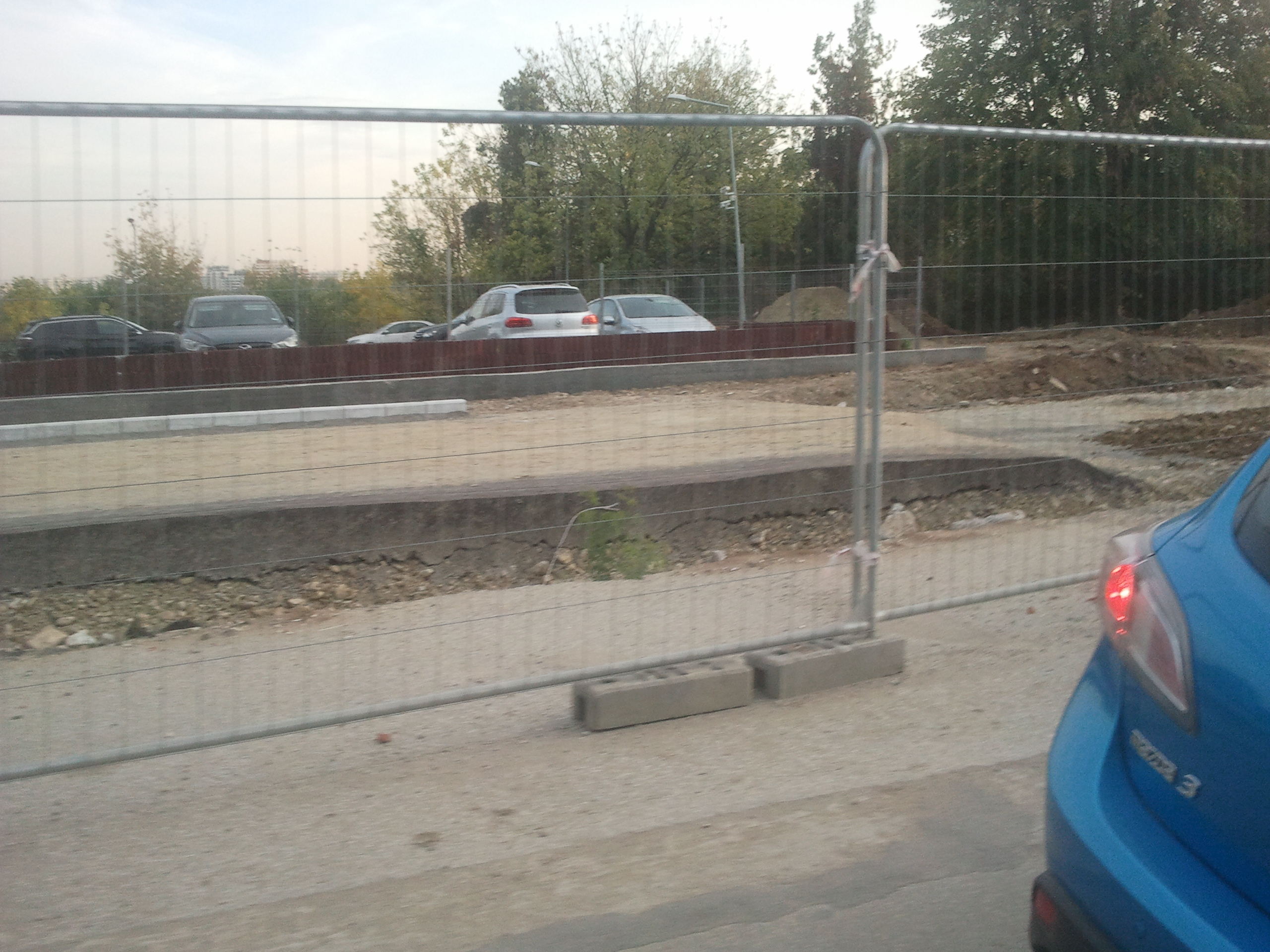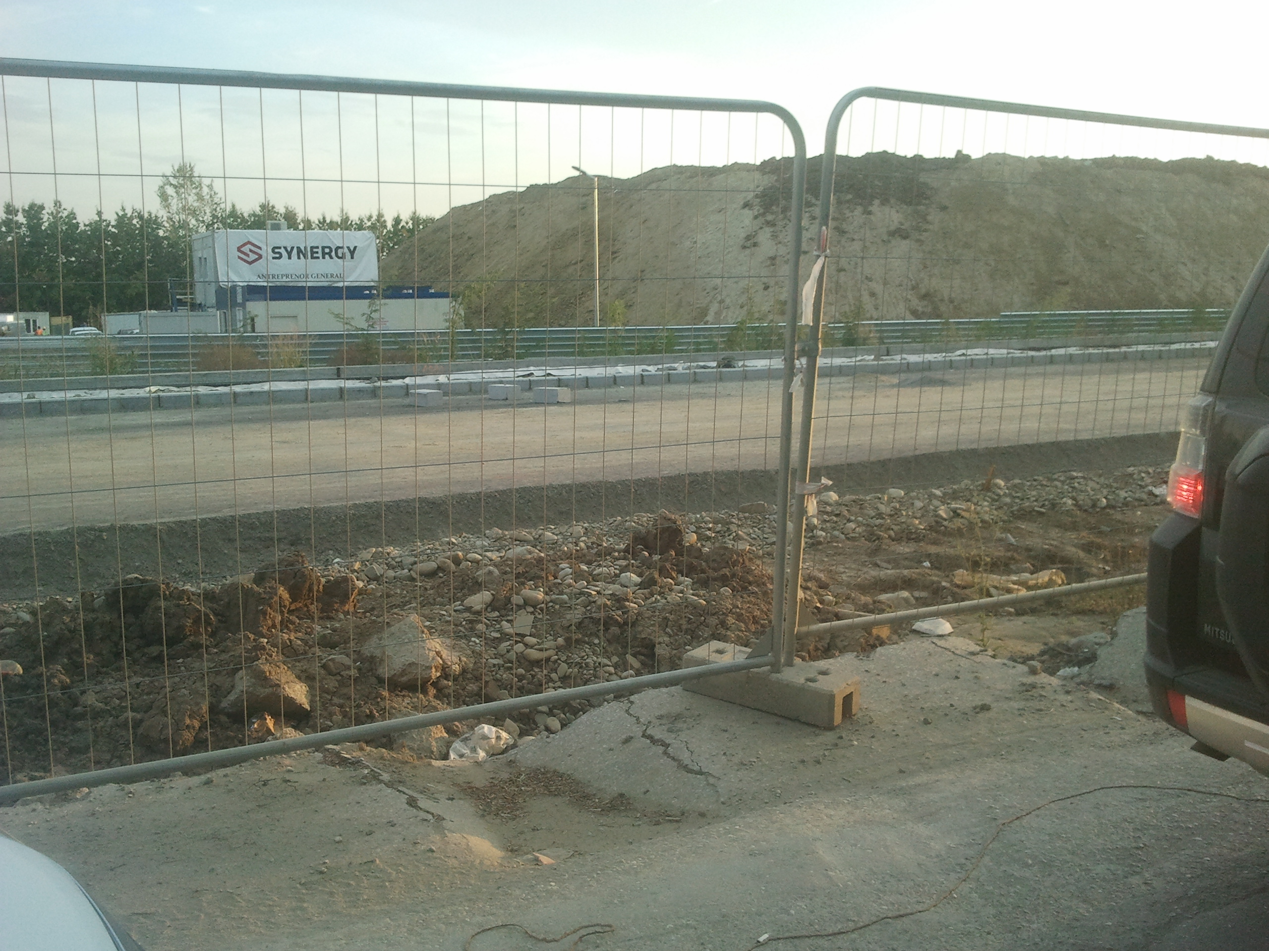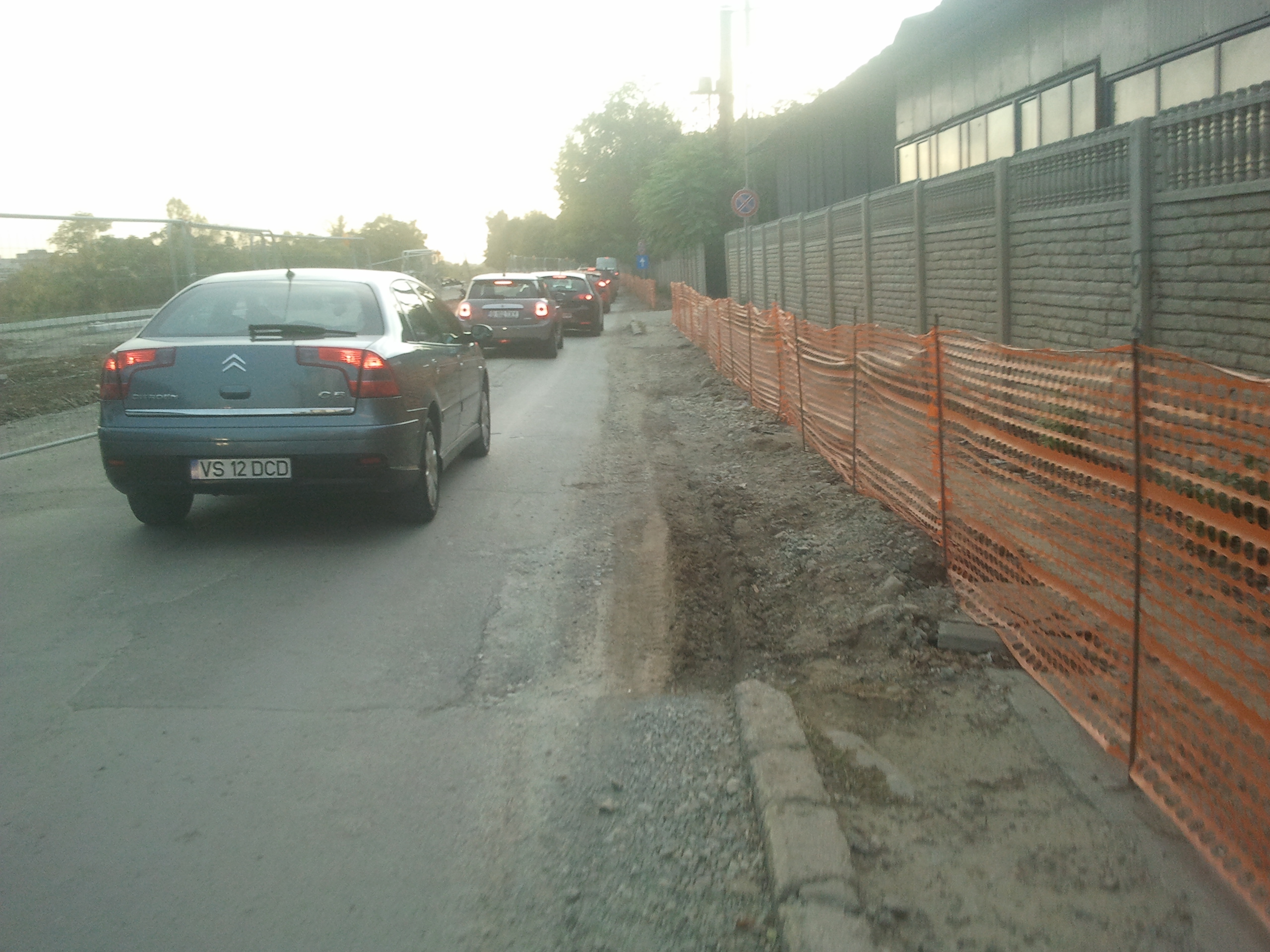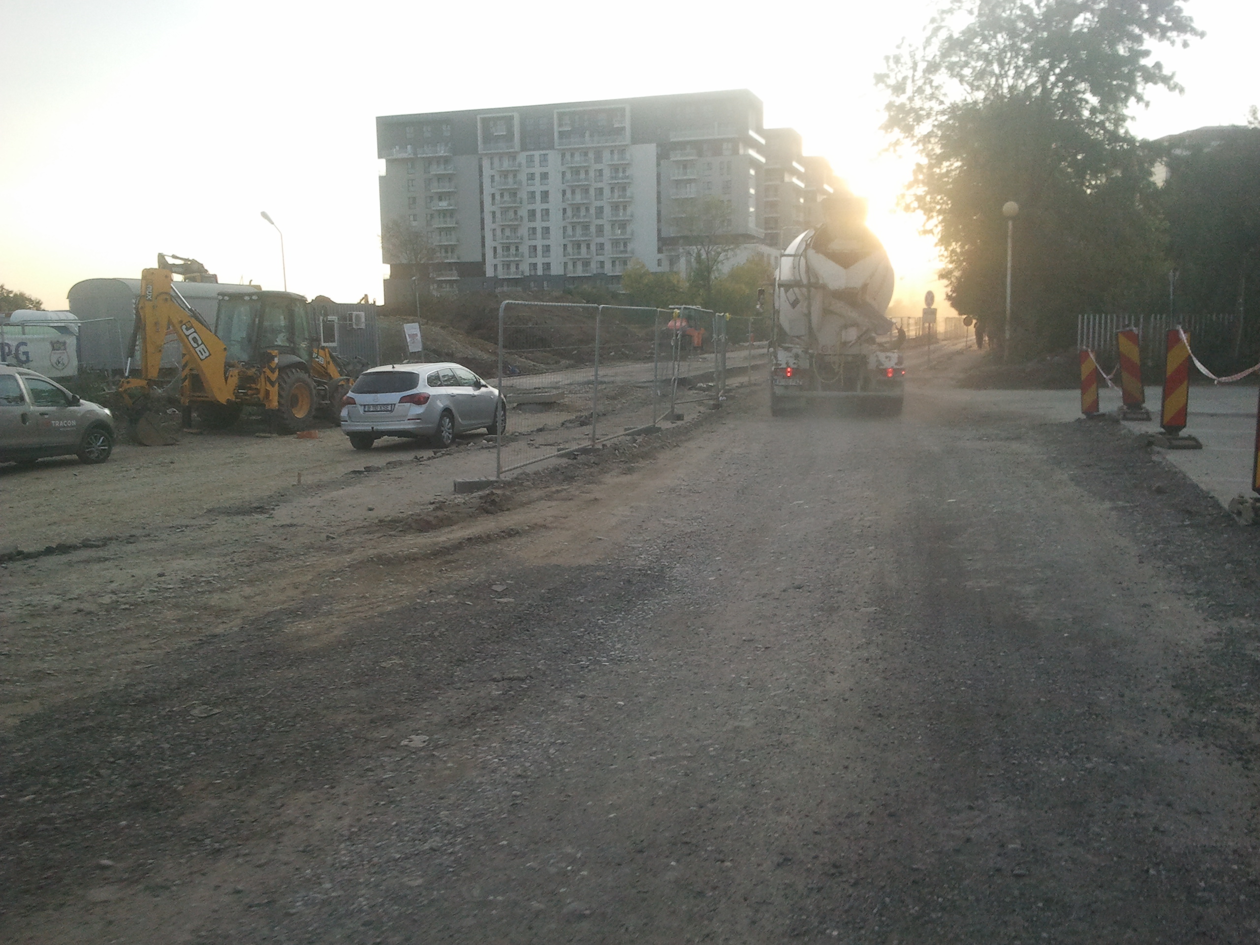 Totusi azi am zis sa profit de ora de varf si de sensul unic pe o singura banda instaurat si sa incerc cateva poze. Carosabilul este de nedescris, gropi peste gropi, praful noriul uscat si molozul sunt la ele acasa, orice basculanta, orice betoniera trece ridica un nor dens de praf care poate bloca chiar si jumatate din lumina directa a soarelui. Cei care circula cu masinile pe aceasta ingustare curenta sunt cu siguranta maestri in masochism, oricat de confortabil ar fi automobilul in cauza. Practic dintr-un kilometru iesi cu masina ca si cum ai fi mers pe camp prin tot colbul.