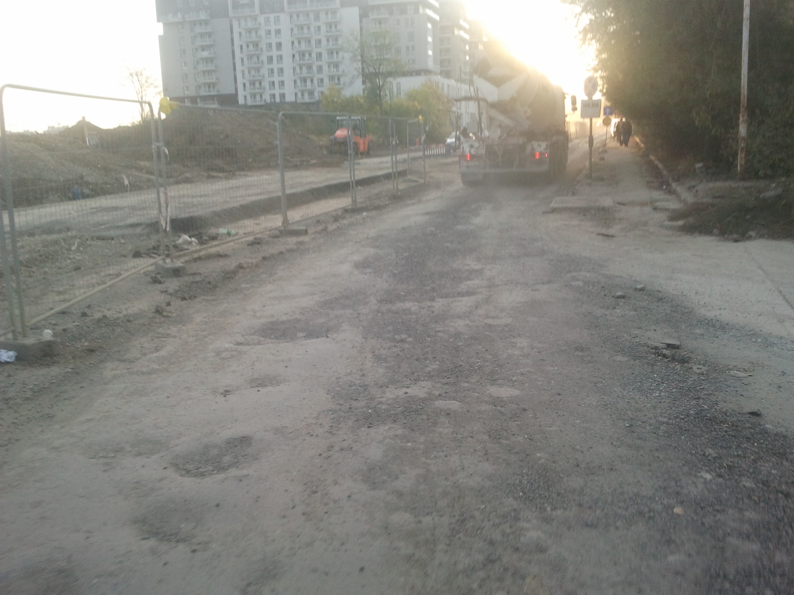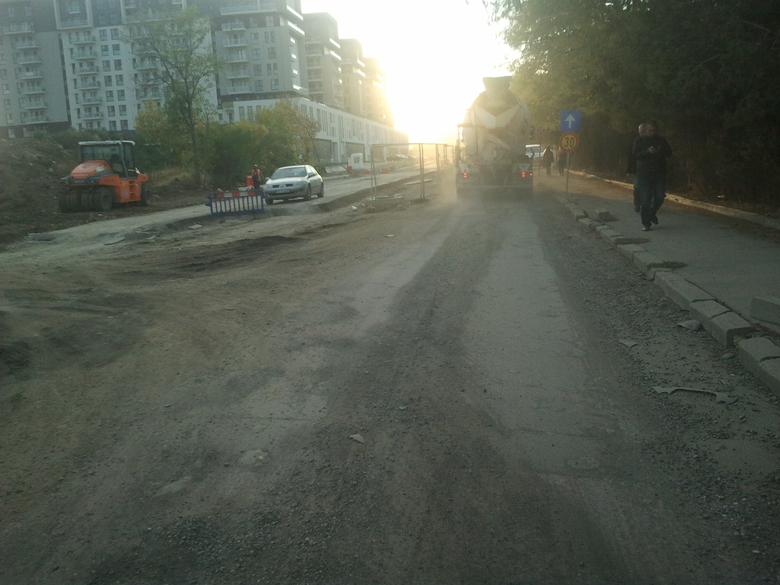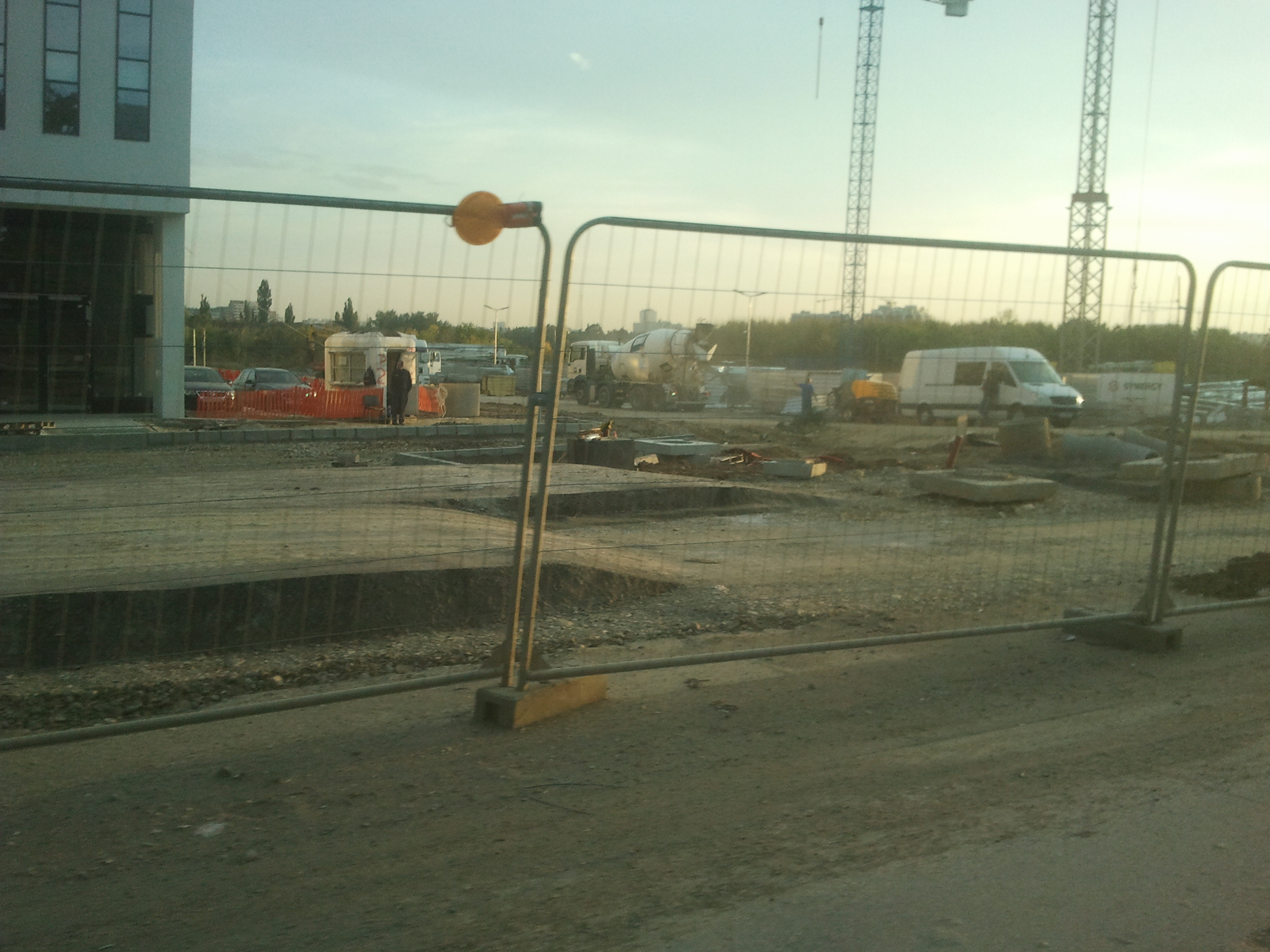 Totusi azi am zis sa profit de ora de varf si de sensul unic pe o singura banda instaurat si sa incerc cateva poze. Carosabilul este de nedescris, gropi peste gropi, praful noriul uscat si molozul sunt la ele acasa, orice basculanta, orice betoniera trece ridica un nor dens de praf care poate bloca chiar si jumatate din lumina directa a soarelui. Cei care circula cu masinile pe aceasta ingustare curenta sunt cu siguranta maestri in masochism, oricat de confortabil ar fi automobilul in cauza. Practic dintr-un kilometru iesi cu masina ca si cum ai fi mers pe camp prin tot colbul.