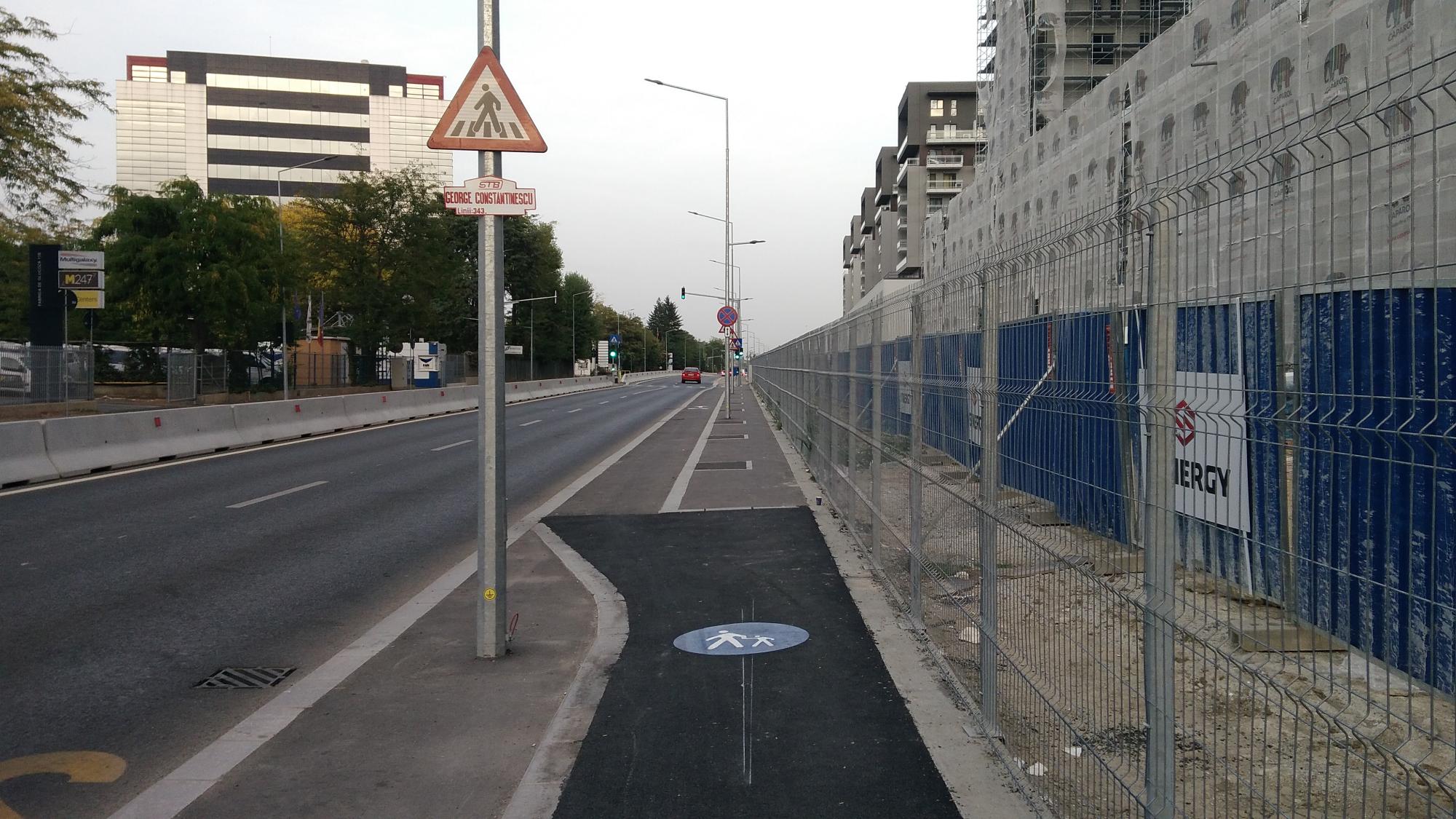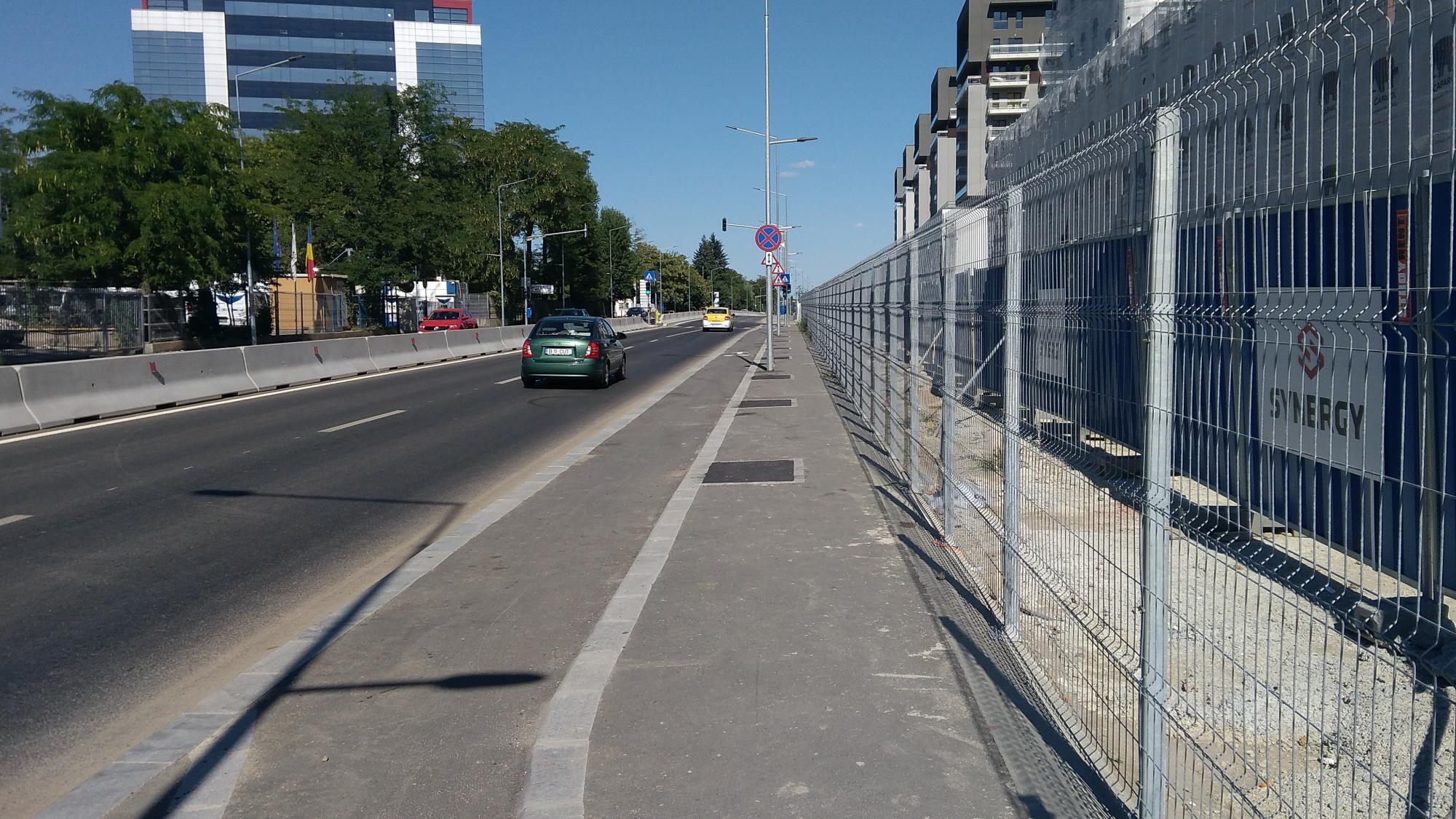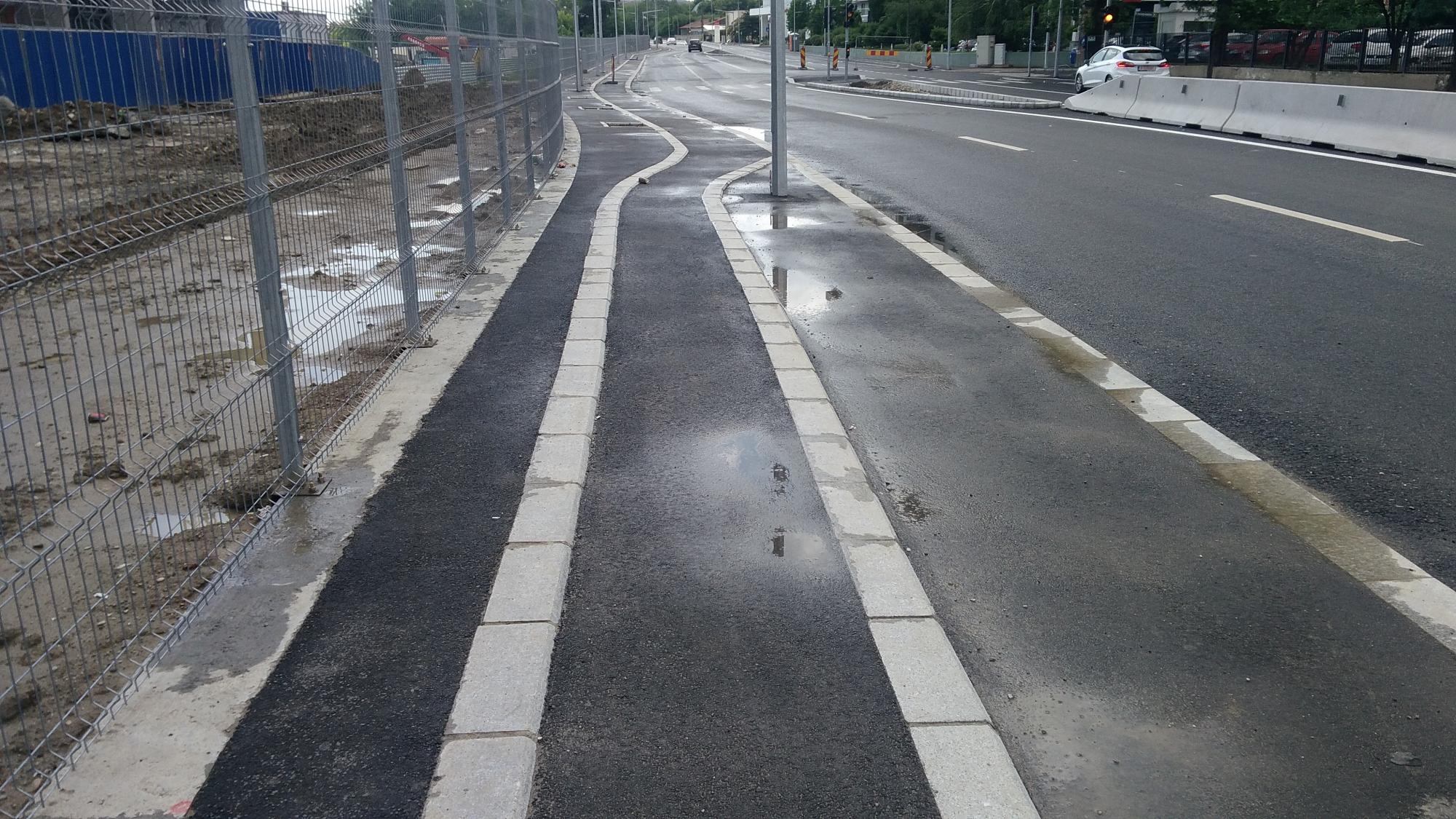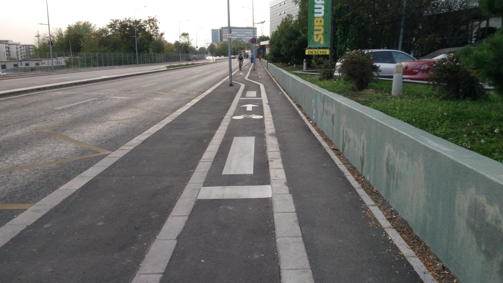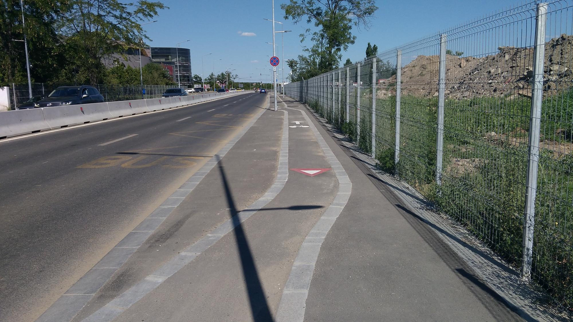 Hai ca nu mai are mult. Trotuarele sunt o bataie de joc, au pe alocuri 50 de centimetri latime, cu o bordura care merge ba semicentrat ba in zig-zag pe post de separator intre pista de biciclete si trotuarul propriuzis. Putea sa fie o dunga alba de termoplast la fel de bine. Dar de ce sa nu bagam mai multe borduri... :evil: