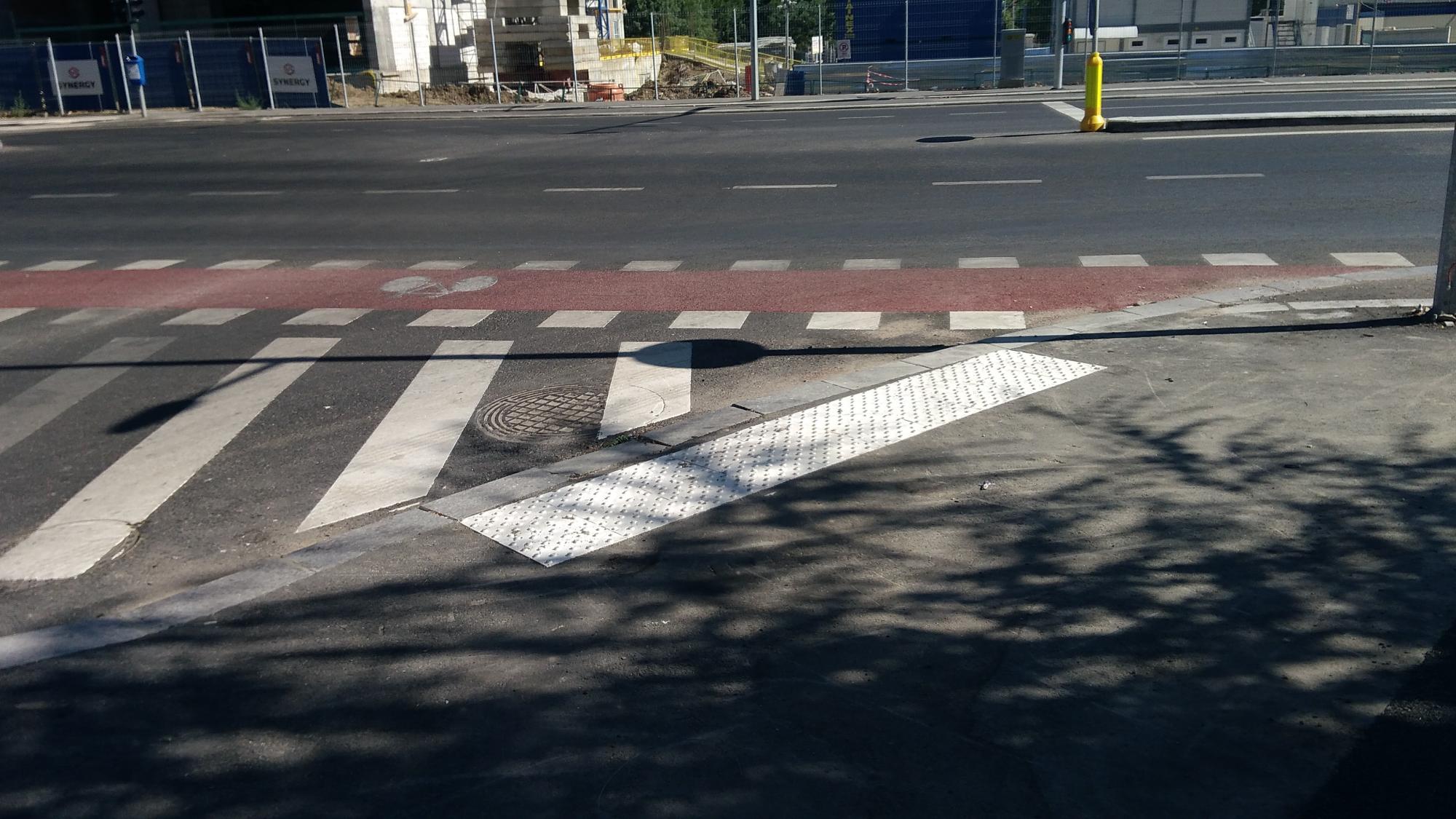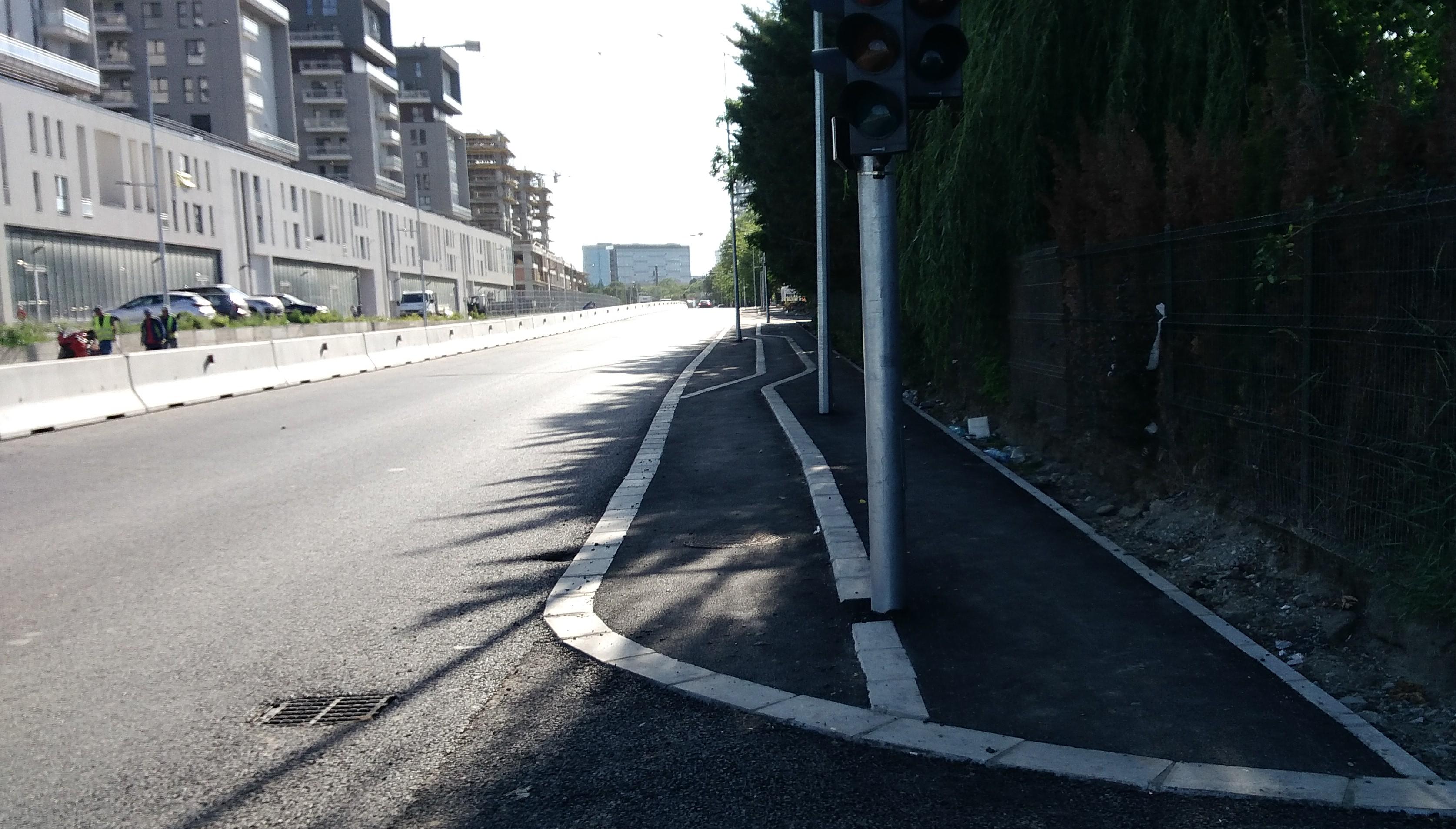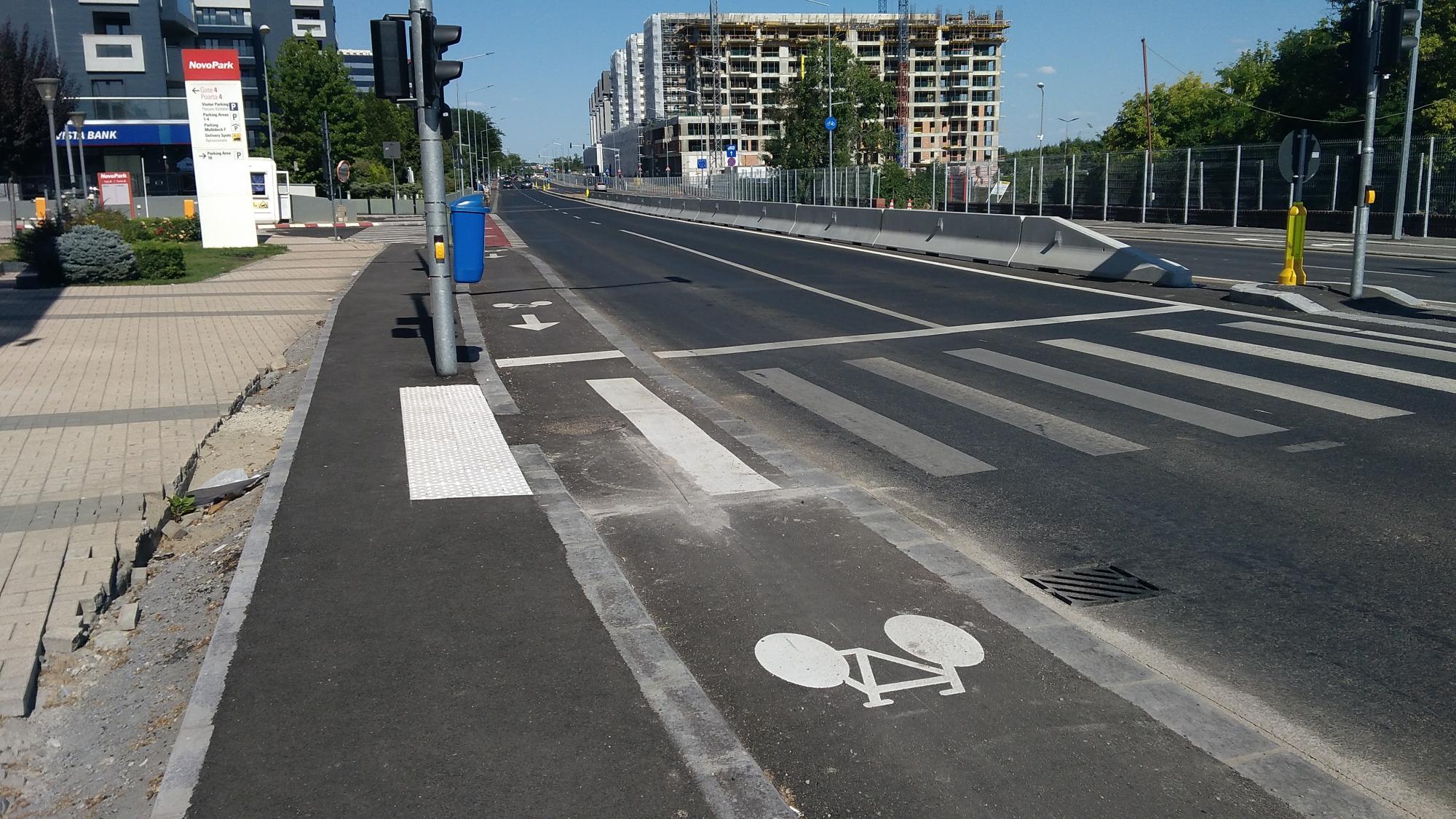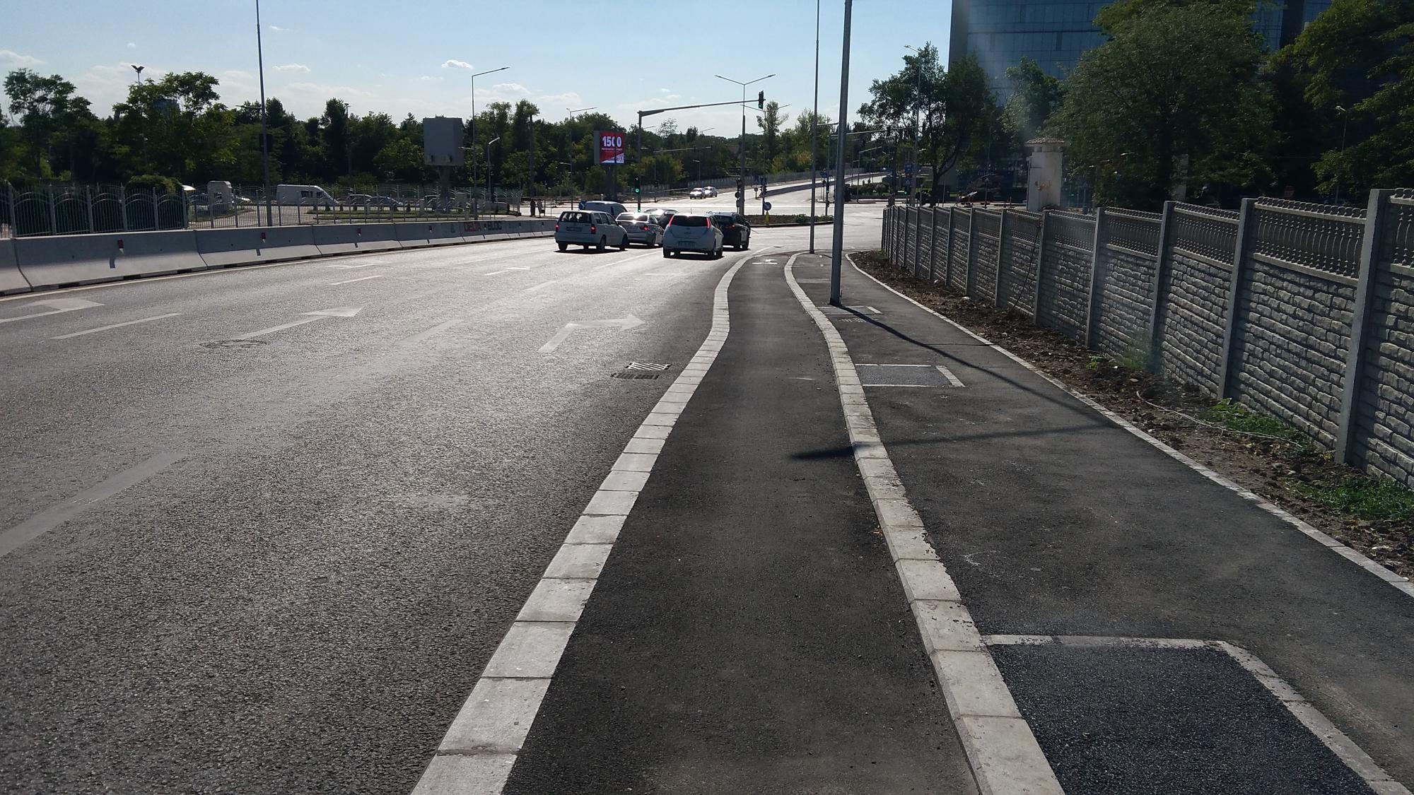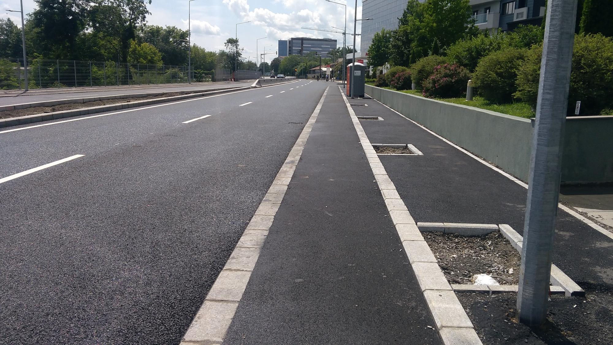 Hai ca nu mai are mult. Trotuarele sunt o bataie de joc, au pe alocuri 50 de centimetri latime, cu o bordura care merge ba semicentrat ba in zig-zag pe post de separator intre pista de biciclete si trotuarul propriuzis. Putea sa fie o dunga alba de termoplast la fel de bine. Dar de ce sa nu bagam mai multe borduri... :evil: