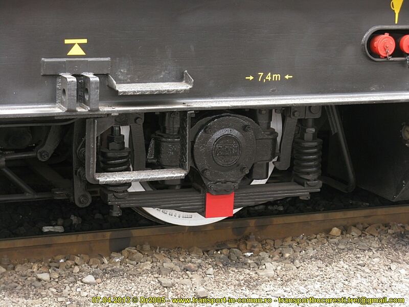 Pe cutiile de osie este sigla BDJ (Căile Ferate Bulgare), iar plăcuţa este în engleză. Oare locomotiva provine din Bulgaria? Numărul de fabricaţie este greu lizibil.