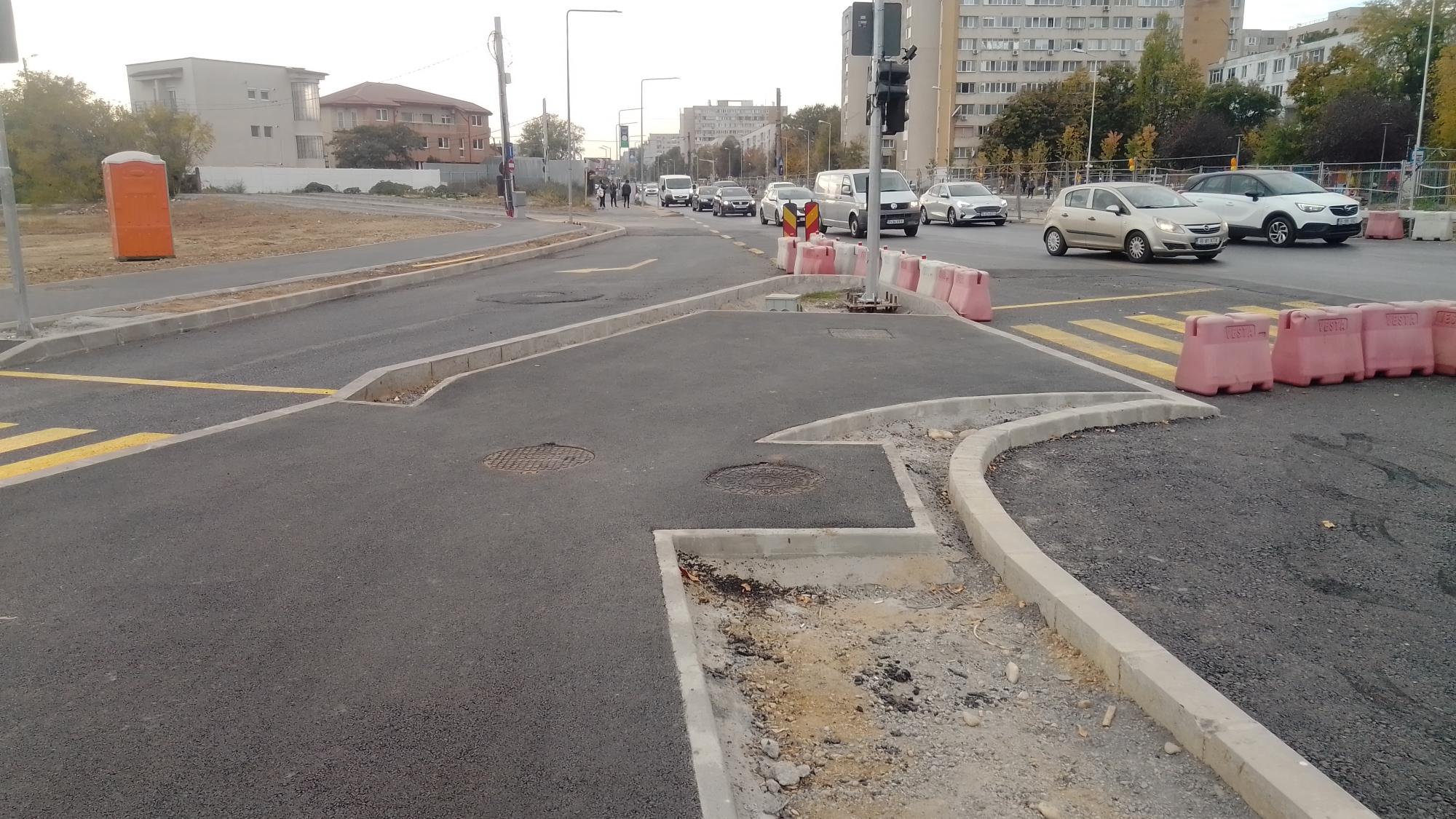 Să nu mai zic de câte rânduri de borduri sunt, că un spaţiu din ăsta e lăsat şi între şosea şi pista de biciclete, pistă în care oricum or să se verse şi călătorii din autobuze... a, da, pista e doar pe o parte, ce face un biciclist care iese de pe Drumul Cooperativei? Se teleportează pe partea celalaltă? Va avea semafor dedicat stil Ateneu - 5 secunde de verde o dată la 3 minute jumate?