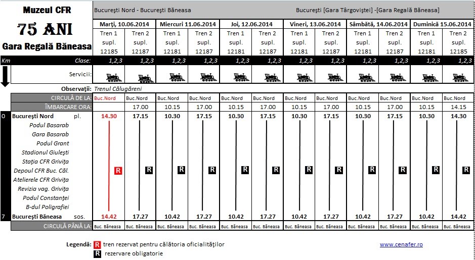 TRENUL CĂLUGĂRENI: va circula zilnic, în perioada evenimentului, pe relaţia Bucureşti Nord - Bucureşti Băneasa, 2 curse pe zi.