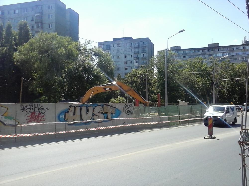 O vedere in lungul bulevardului cu zona statiei Romancierilor. Si aici se asteapta in van o noua deviere a traficului auto peste zona de bulevard refacuta peste planseul statiei in vederea executarii de lucrari la accesurile neatacate. Desi pregatirile sunt la stadiu de 95% pentru aceasta mutare.