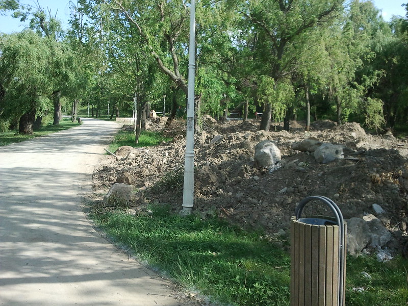 Investitia de amenajare a parcului de pe vremea fostului edil (in mod foarte hazliu tot un Negoitza) este nimicita sub rotile basculantelor si excavatoarelor. Iluminatul in parc nu mai functiona (deloc) de ceva vreme, acum zonele inierbate au ajuns depozit de moloz si pamant excavat iar aleile (toate) sunt drumuri tehnologice pentru basculante. Plimbaretii de ocazie impart acum un parc (si un santier) cu muncitorii si utlajele.