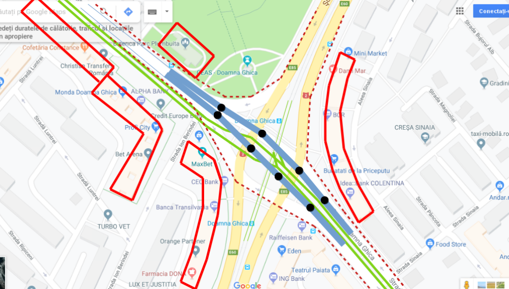 In al doilea rand nu le solicita nimeni sa treaca tramvaiul pe pasaj, de fapt ar fi o imbecilitate sa fie urcat pe pasaj, dat fiind ca linia aceea potentiala de la Luica la Petricani ar trebui sa fie deservita si de Depoul Colentina si implicit trebuie macaze la sol spre depou cel putin. Partea proasta este ca intersectia aia este denivelata rau fata de planul arterei Doamna Ghica la stanga si la dreapta si se evazeaza/ingusteaza foarte subit iar tramvaiele ar stationa la semafor intr-o panta foarte abrupta (cam ca la Sincai).