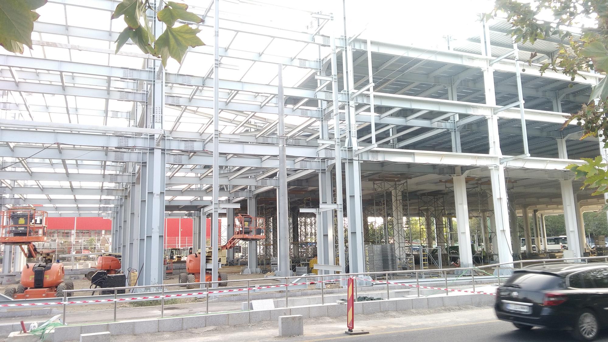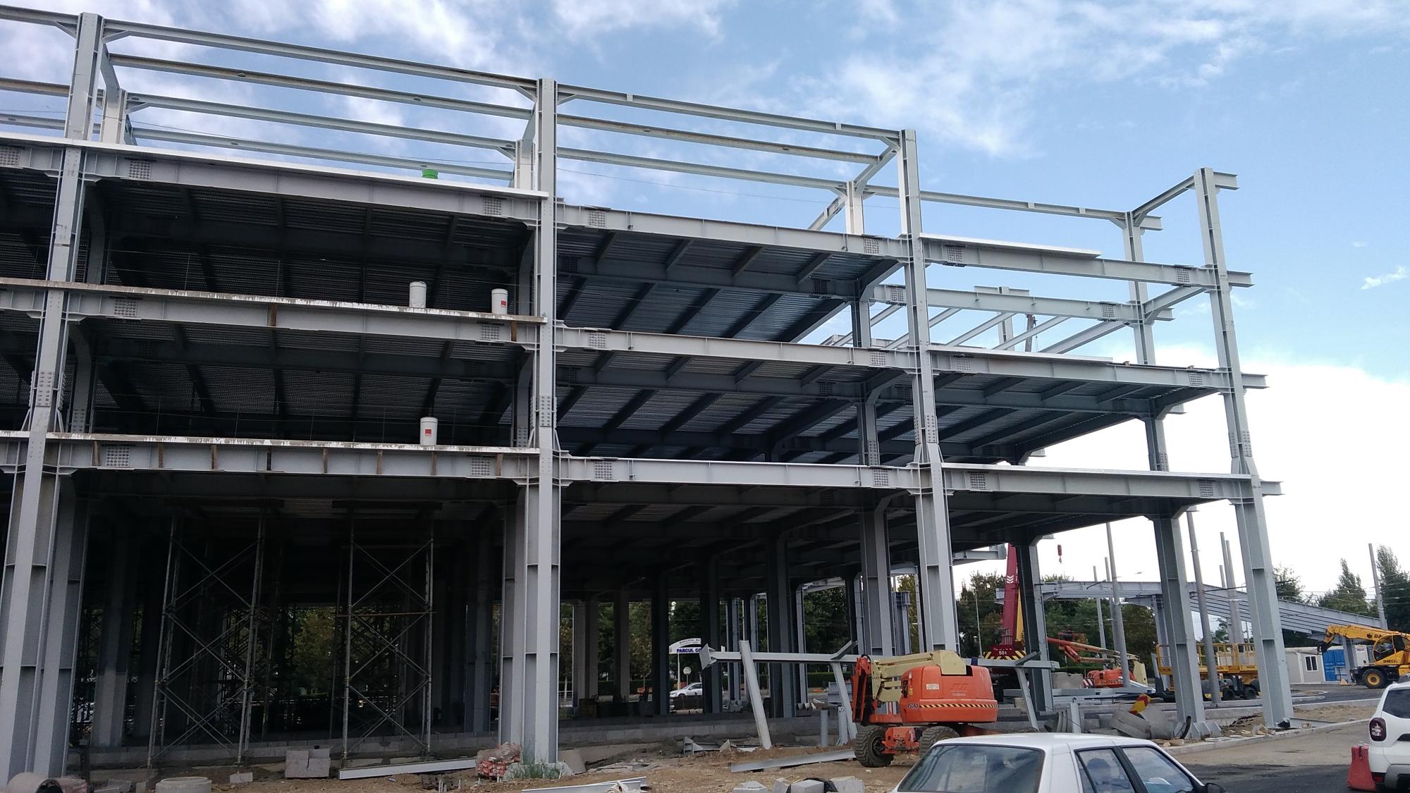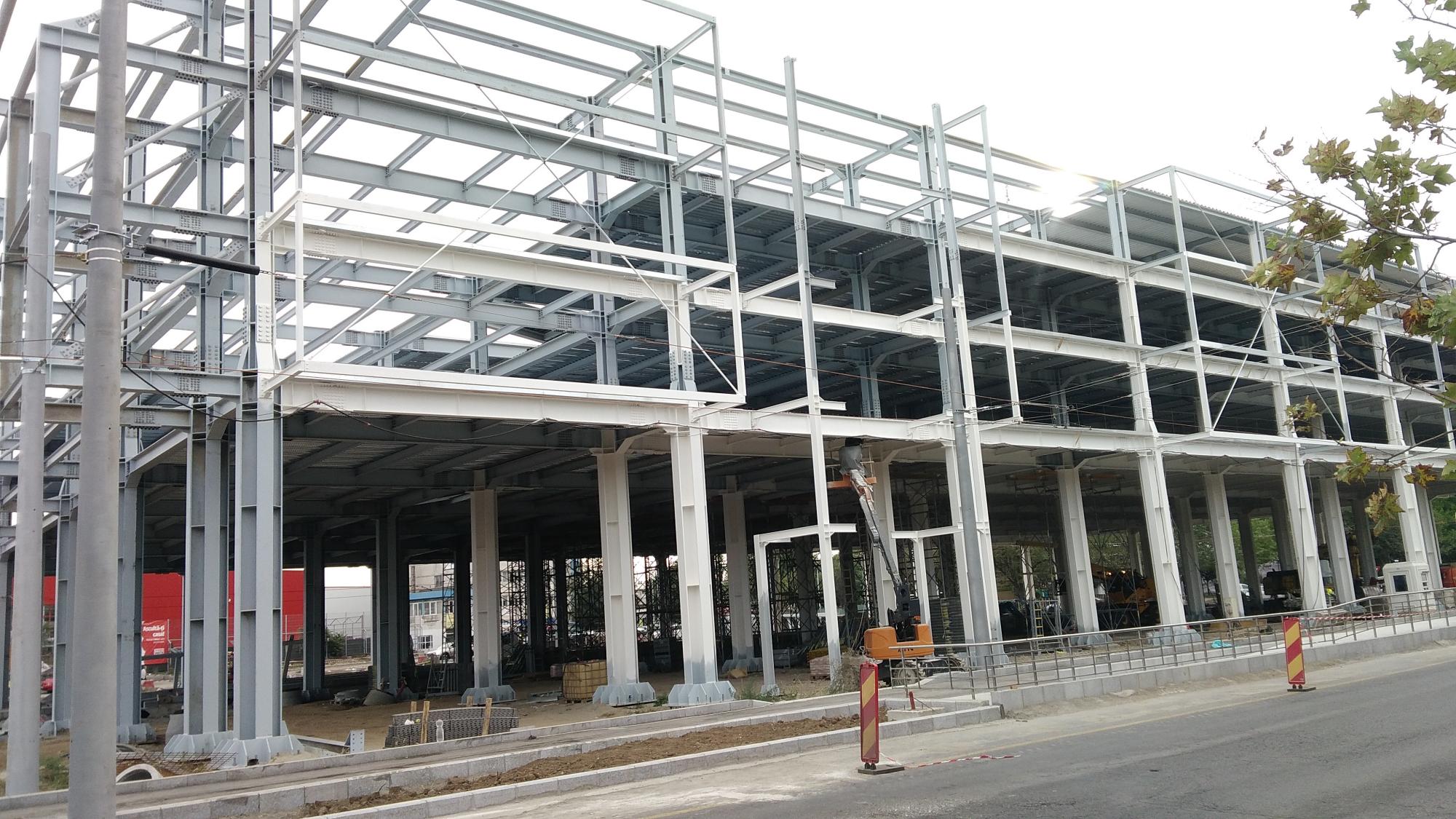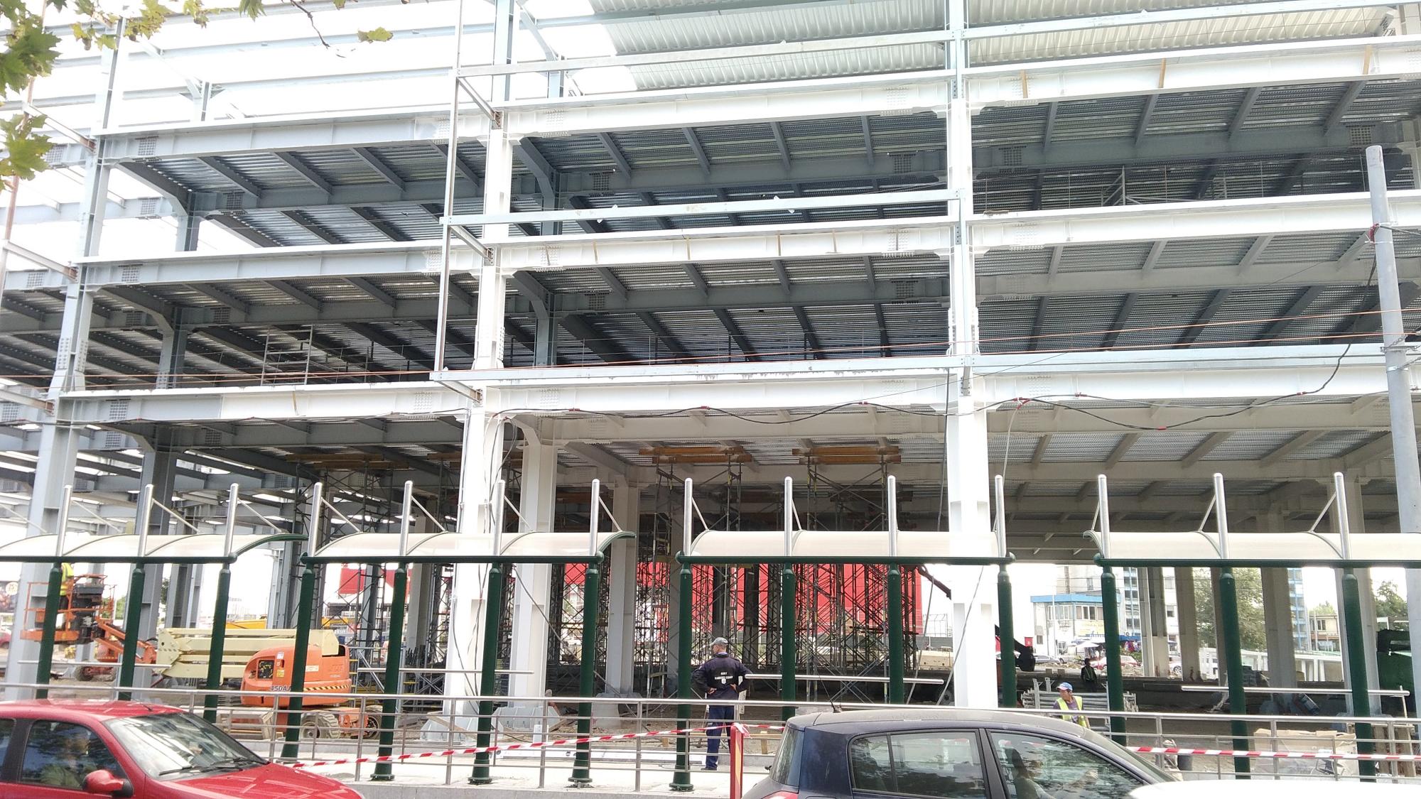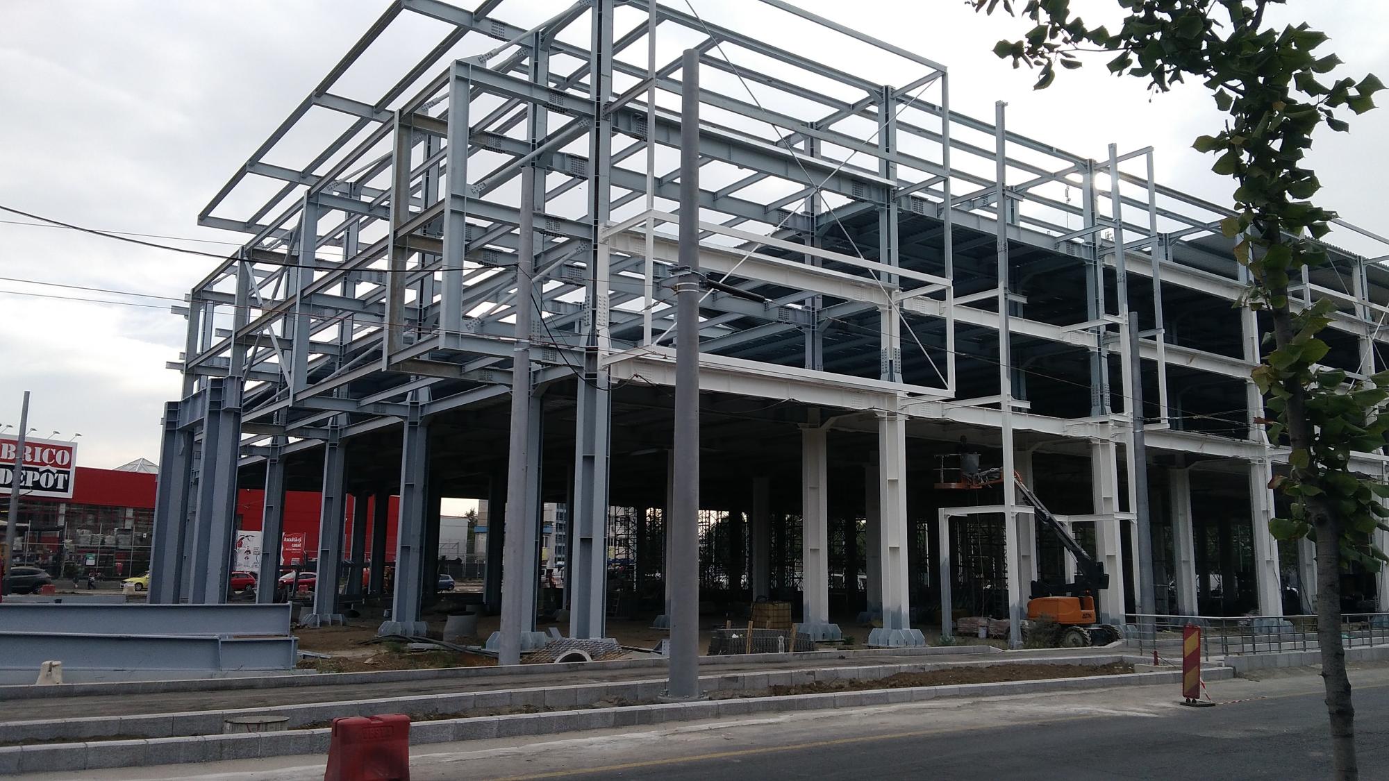 Avem practic toti stalpii la verticala, 9 randuri si tabla profilata pentru planseele colaborante este montata intre randul 1 si randul 3 de stalpi peste parter, peste nivelul 1 si peste nivelul 2.