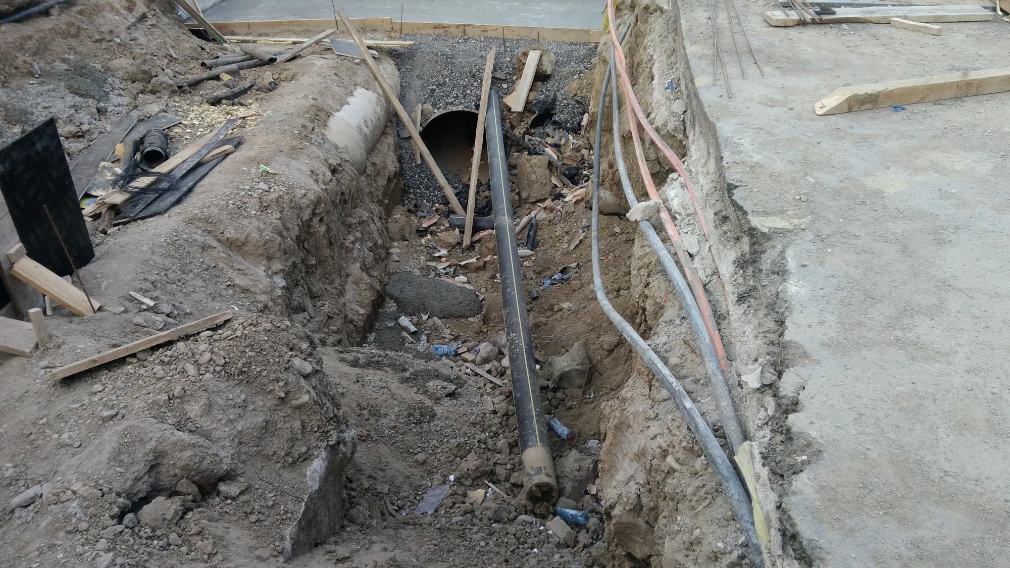 Santul cu de toate dintre Str. Sinaia si Sos. Gherase, de notat ca teava de gaz a fost suprimata, are dop pus, undeva sub limita de jos a imaginii. Se observa in fundat zona unde trebuie sa se intepe racordul de termoficare pentru blocurile de pe partea Sos. Gherase in magistrala noua.