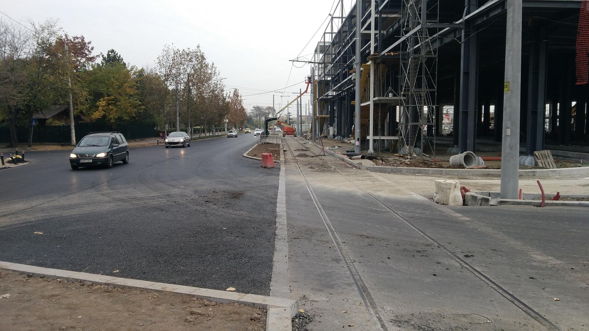 Au mai dat vopsea neagra pe la parter si au ajuns chiar si la etajul 1. A inceput montarea iluminatului, in primul rand stradal pe stalpii tramvaiului dar si interior, unde fiecare stalp ce delimiteaza cele doua fire ale tramvaiului a primit cate patru proiectoare, unul pe fiecare latura a stalpului. O solutie nu tocmai fericita, se preta un iluminat pe stalpi mici, gen pietonal, incadrati in peroanele tramvaiului. Oricum, e un pas inainte. Pe la rampa de iesire n-au mai avansat sensibil, in schimb au inceput sa scoata bordurile de langa parcul Cosmos, desi sunt BORDURI NOI plantate in cadrul proiectului. Aparent incearca sa lateasca un pic carosabilul sau pur si simplu vor satraga ceva tubulatura pe sub borduri, este o tubulatura noua care vine si prin trotuarul de langa primul bloc.