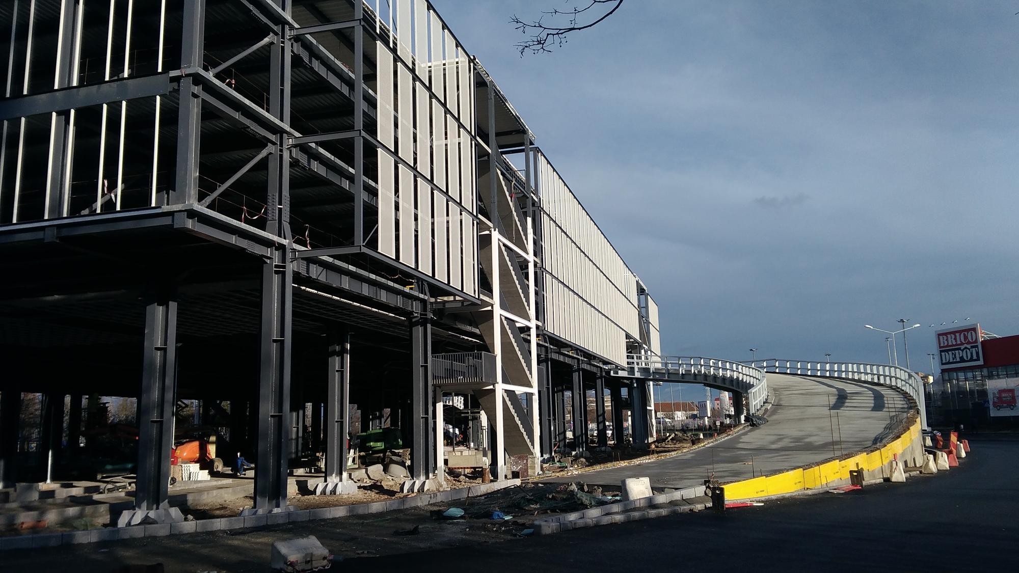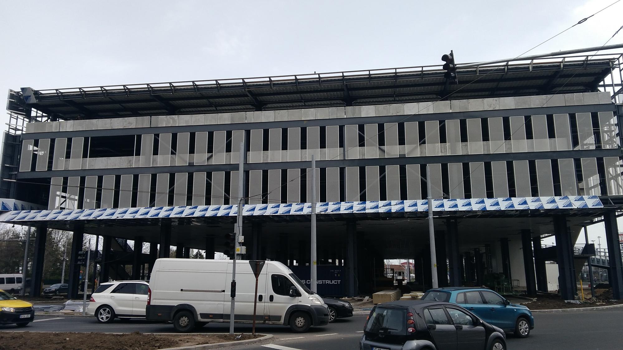 Au mai dat vopsea neagra pe la nivel 1 si nivel 2, tabla de "acoperis" partial pare completa. Au montat reflectoarele pe primele cinci randuri de stalpi la nivel parter (care au primit vopsea neagra deja) si au inceput sa traga tubulatura pentru canalizare (coloane). Se vedeau si niste paleti in parter, cred cu borduri. Au adus armatura pentru rampa auto de iesire. La scari se avanseaza mai lent. N-au venit inca stalpii pentru rampa auto de intrare.
